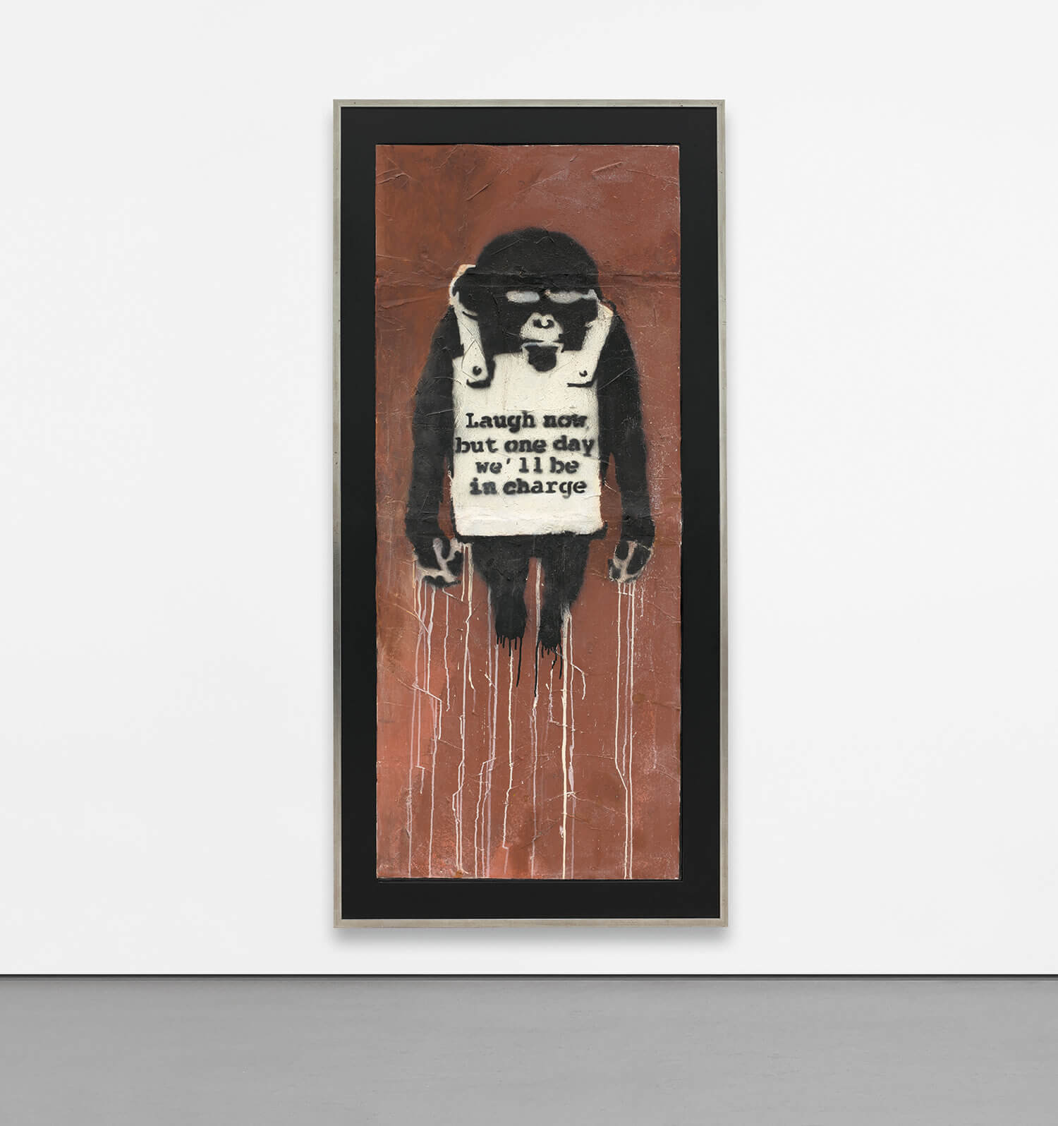 Laugh Now Panel A, 2002, hails from anonymous artist and social activist Banksy’s well-known Laugh Now series. For the past two decades, Banksy’s work has drawn both praise and controversy, and nowhere is his simultaneous appeal and notoriety more present than in the present work, Laugh Now Panel A. It portrays a forlorn monkey, wearing a sandwich-board bearing a very specific memo: “Laugh now, but one day we’ll be in charge”. Comprised of his signature means of urban expression—namely with the depicted board spray-painted with his own stencil designs—the sardonic work perfectly encapsulates Banksy’s modus operandi while conjuring dark and cynical thematic undertones.
