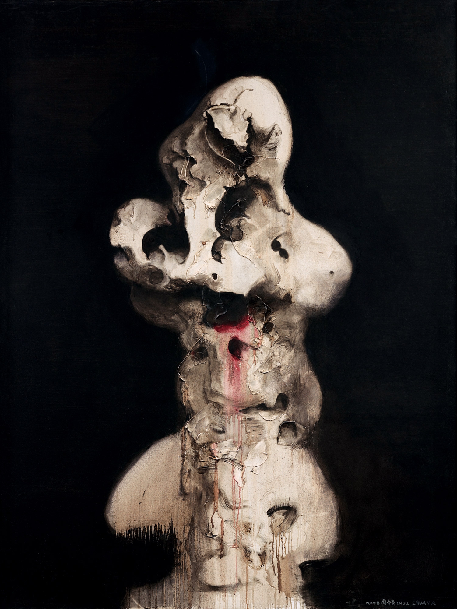 After the "Green Dog" series, Zhou Chunya starts to focusing on rocks once again, but the style of these rock are very different from his previous paintings. In 2000, Zhou Chunya went to Suzhou for relaxing, the oddly shaped Taihu lake stones in those classic gardens inspired him to create. These unusual stones of aggressiveness and charming contradictive tergiversation with a touch of redness makes the stones paintings catching people’s eyes.