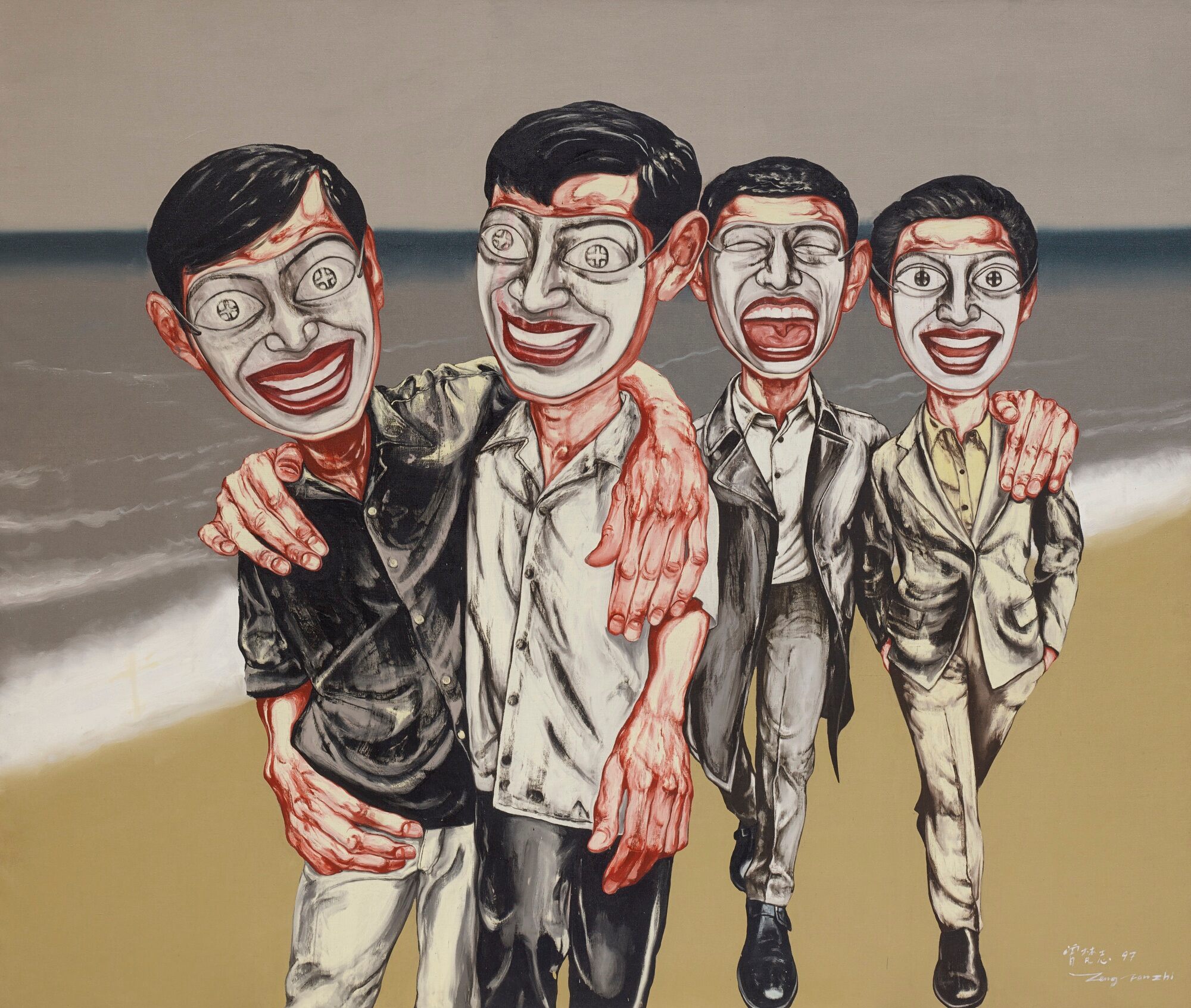 Zeng Fanzhi came to Beijing in 1993, he doesn’t has much friends when he first came, and he had to see a lot people in many occasions. He has been put into a total unfamiliar environment than he was in Wuhan before. This pushed him to a transaction, to let him expressed the loneliness and estrangement on canvas