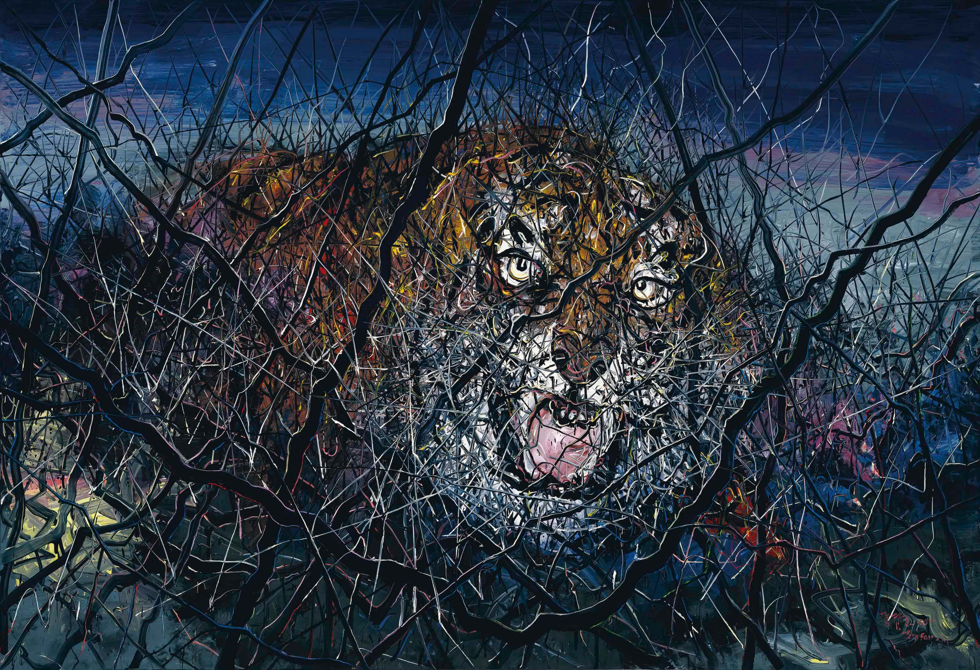 Zeng Fanzhi started to paint some abstract painting, but they are not completely abstract, they are more like a blending of abstraction and concretion. In this period of time, his images zoom into landscapes, animals and people, everything were covered by dried out plants, things are overlaid on top of each other with retrograding brush strokes. These painting are making people feel depressed and frustrated.