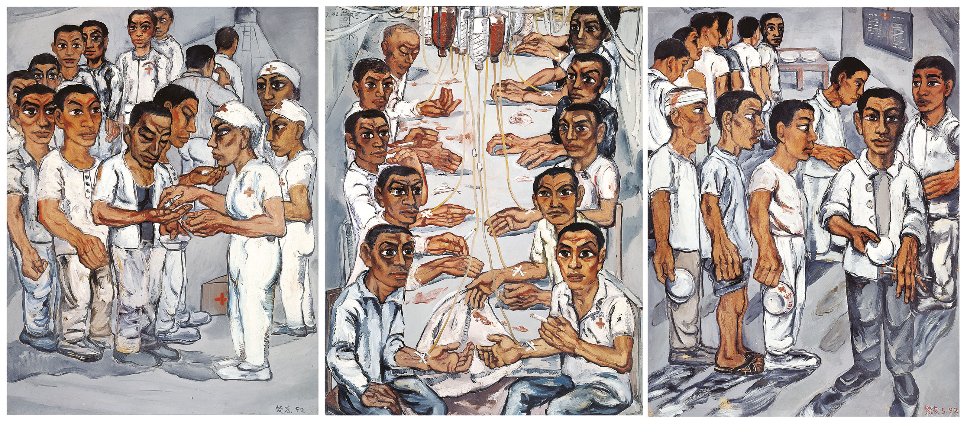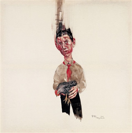After entered the art school in 1987, Zeng Fanzhi found the way of teaching and their standards to a good student is very different from his idea. He starts looking for a better way to express himself. At the time he lived by a hospital in Wuhan. Because he doesn’t have a bathroom in the house, he has to borrow the hospital’s bathroom every day. The patient in wards, or wondering on the lounge with their infusion bottles became the daily views in Zeng Fanzhi’s life. So the operating table, human bodies and their cramping facial expression became the inspiration of his works, and turns into a series works "Xiehe Hospital".