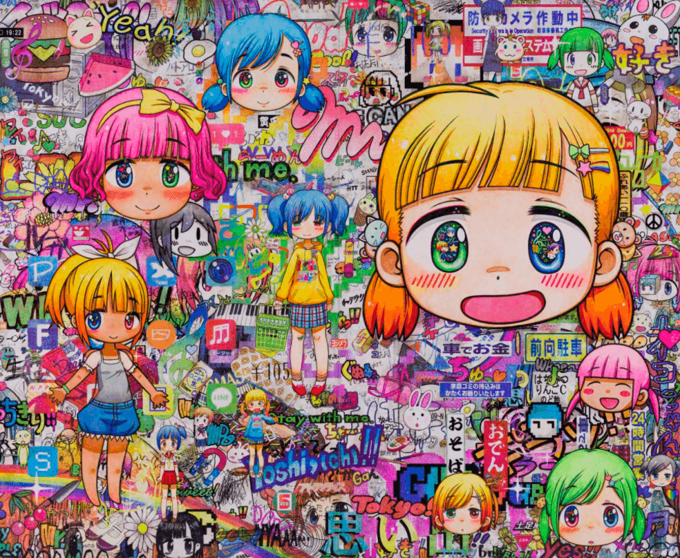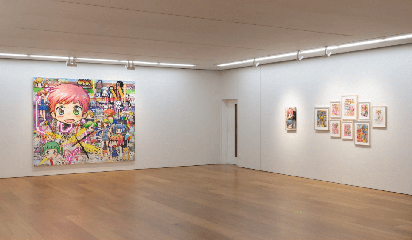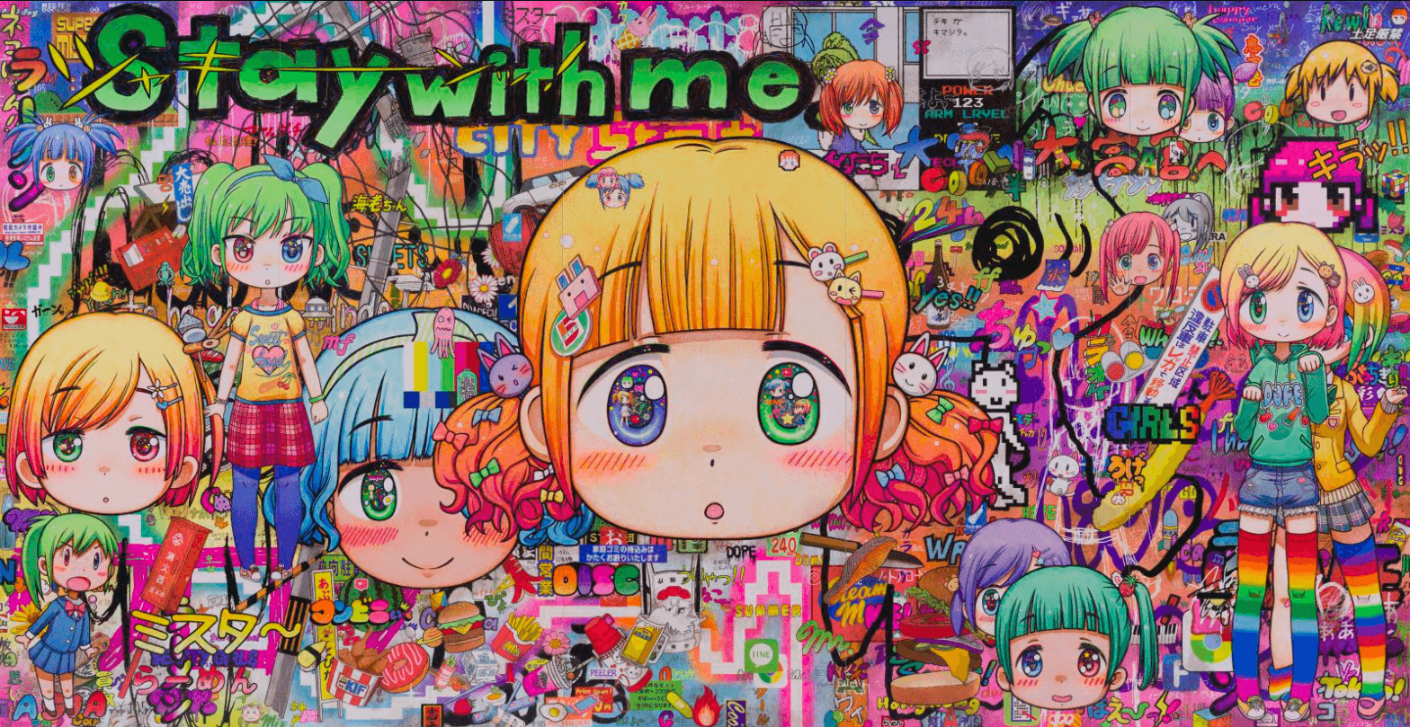 Mr.(1969 年生於日本Cupa)的新波普美學橫跨繪畫、雕塑、裝置和視頻。藝術家與由村上隆開創的“超扁平運動”關係密切,經常使用漫畫與動畫描繪個人幻想。雖然一直從禦宅文化與其群體中汲取創作主題和元素,但更確切地說,他是一位自稱為御宅族藝術家的人。 Mr. 筆下的卡通形象基本上是由年輕人物構成的,以喚起“萌”(與對虛構人物的迷戀相關的日本詞彙)的感覺。在典型的卡哇伊風格中,Mr. 有時描繪孩子般的面容(圓臉龐、大眼睛、色彩斑斕的頭髮),帶有天真的基調。與那些充滿力量的人物所表現的鮮明的快樂相比,孤獨、社交焦慮和恐懼則更廣泛地體現在他的創作中。