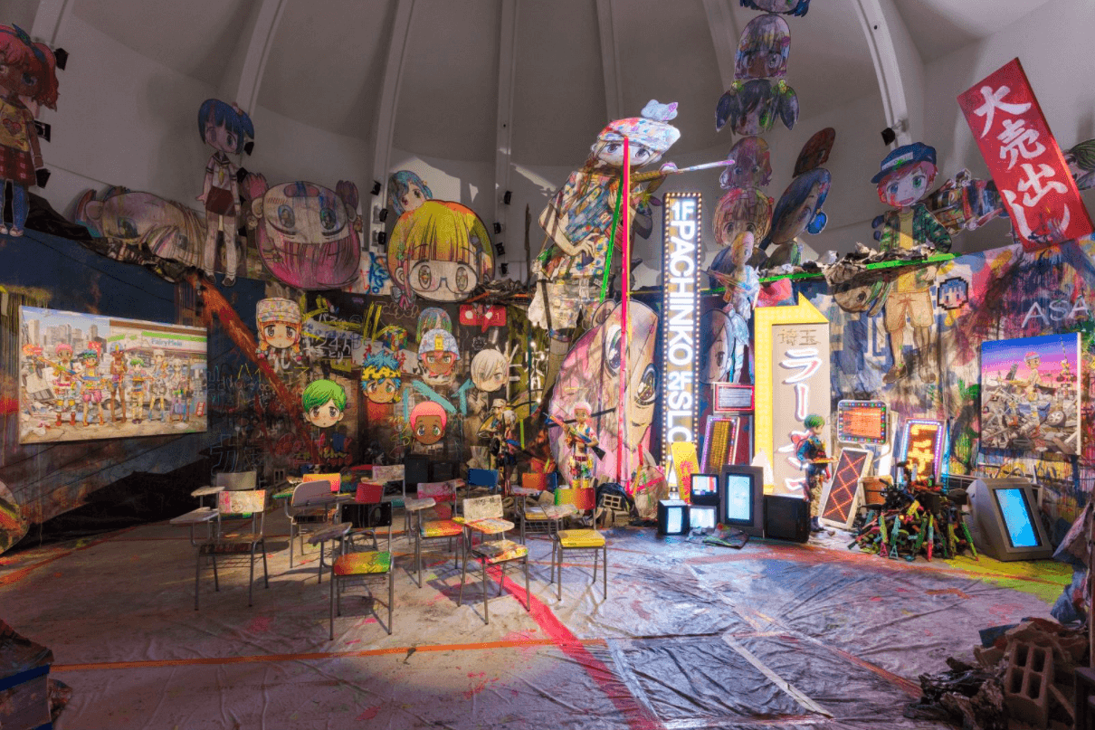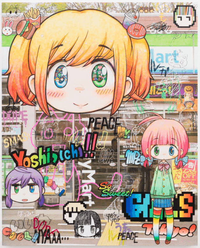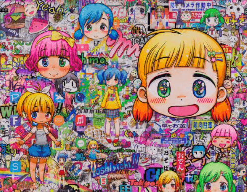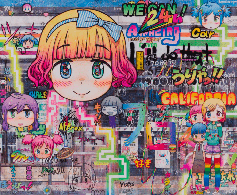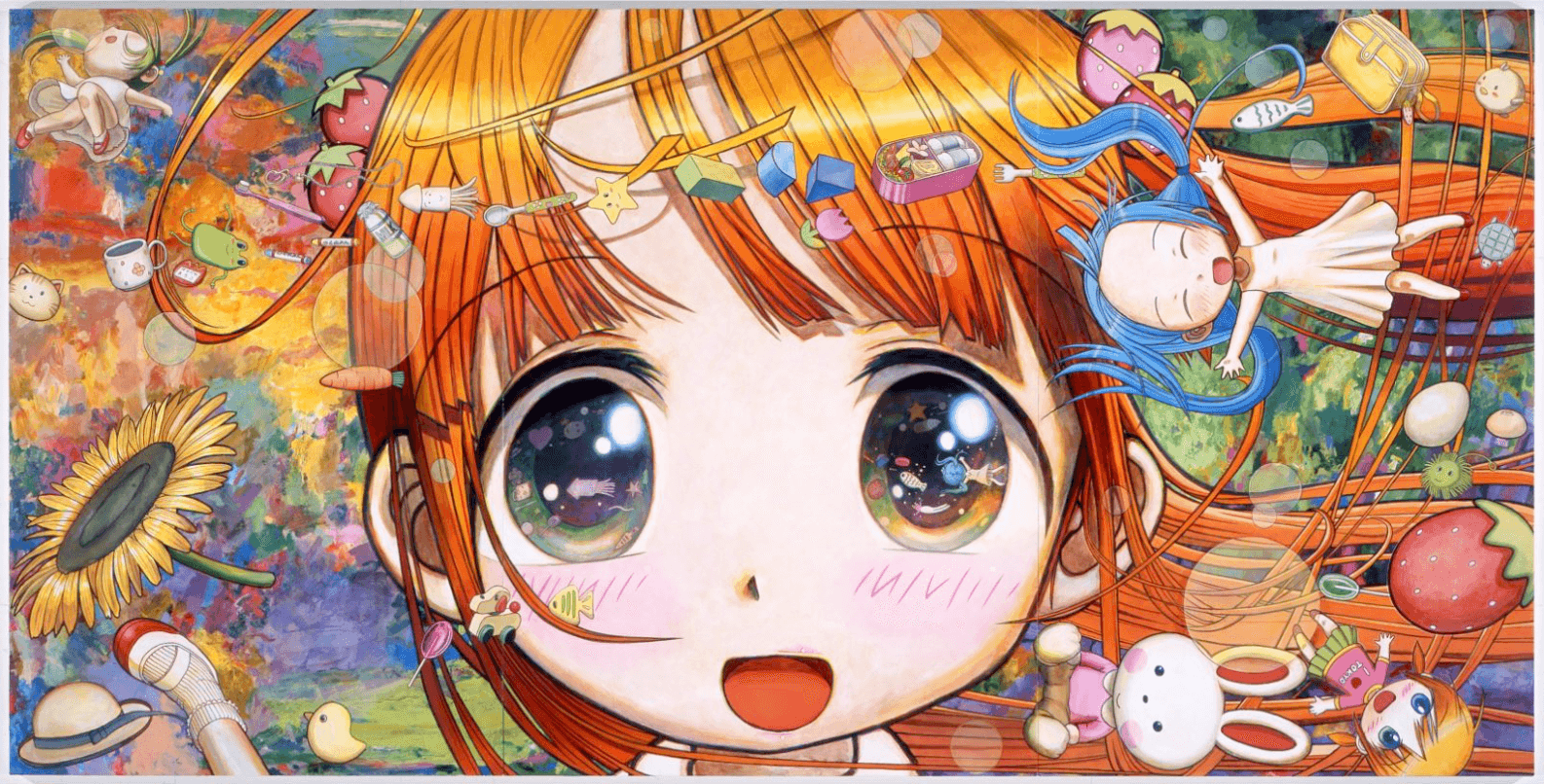 Mr.(1969 年生於日本Cupa)的新波普美學橫跨繪畫、雕塑、裝置和視頻。藝術家與由村上隆開創的“超扁平運動”關係密切,經常使用漫畫與動畫描繪個人幻想。雖然一直從禦宅文化與其群體中汲取創作主題和元素,但更確切地說,他是一位自稱為御宅族藝術家的人。 Mr. 筆下的卡通形象基本上是由年輕人物構成的,以喚起“萌”(與對虛構人物的迷戀相關的日本詞彙)的感覺。在典型的卡哇伊風格中,Mr. 有時描繪孩子般的面容(圓臉龐、大眼睛、色彩斑斕的頭髮),帶有天真的基調。與那些充滿力量的人物所表現的鮮明的快樂相比,孤獨、社交焦慮和恐懼則更廣泛地體現在他的創作中。