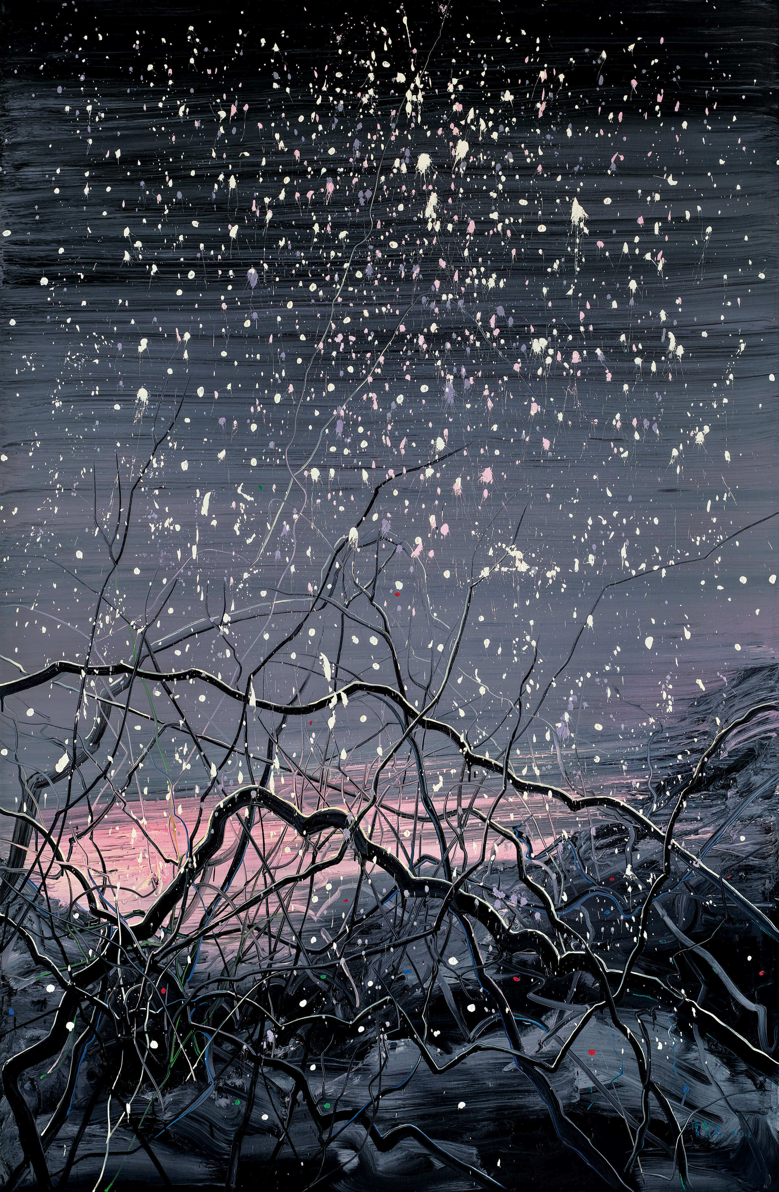 A review of Zeng Fanzhi ’s 2002 Chaotic Brush series shows that he has produced only three snowscape works in his career and the auctioned work is both the first and largest such painting. As such, it clearly represents an important change in the artist’s mindset at that time. In Untitled, the snow reflects the morning glow as it flies through the air and falls to Earth, the vivid snowy white, pink and purple surrealist colors coming from the romantic imaginings of memory. From within the dark deep night a rose red hue radiates like the cheek of a young girl, the smudged purple night ensuring the boundless land exudes hope hidden in the darkness of night. The work was inspired by the landscape view outside of the window of Zeng's studio, though the more relaxed structure represents a movement away from the pressure of the twisted roots and gnarled branches in earlier Chaotic Brush series works. The work participated in Zeng's solo exhibition in London Gagosian right after its finished, and was collected by prominent collectors couple Mr. and Mrs. Schull, sponsors of Southbank Art Center, London. It has also participated in artist’s solo exhibition in Musée d'Art Moderne de la Ville de Paris, and selected by Zeng as the cover page of artist’s studio webpage, demonstrates the importance of the piece to the artist. It is the first time it has appeared on auction market ever, and could be a rare opportunity to collectors as a valuable piece in artist’s career.