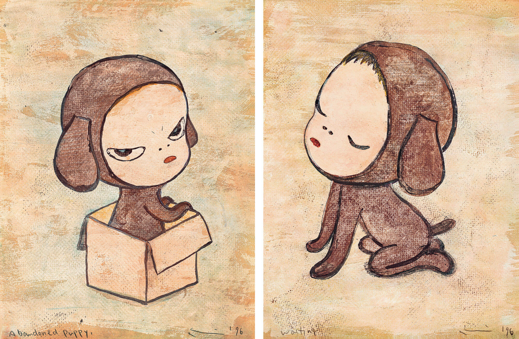 Abandoned Puppy and Waiting(Diptych) on sale are a typical embodiment of his loneliness in the early 1990s and his art experiments in Germany. The two paintings feature the trademark composition of the artist and two childlike characters. The two kids serve as the prototype of his future series Sleepless Night and Night Walker and pave the way for his style evolvement in later stages. In the twin paintings, Yoshitomo Nara portrayed two children in brown dog costume sitting face to face. One stays in a paper box looking around as if to fend off the concerned glances with his disdainful look. Her mate, in contrast, bendsover to the ground with her head up waiting forcaring attention. The vintage tone may remind the viewer of a letter back in their childhood, letting out the artist’s resentful yet somewhat nostalgic feelings. The girl in Abandoned Puppy takes a well-behaved posture that is in stark contrast with her vigilant look, which shows her polarizing mindset. The dog costume matches the style of his Sleepless Night series afterwards. Her squint,in line with the over-exaggerated characters in Ukiyo-e art, qualifies as an example of his continuation of Japanese traditional art.