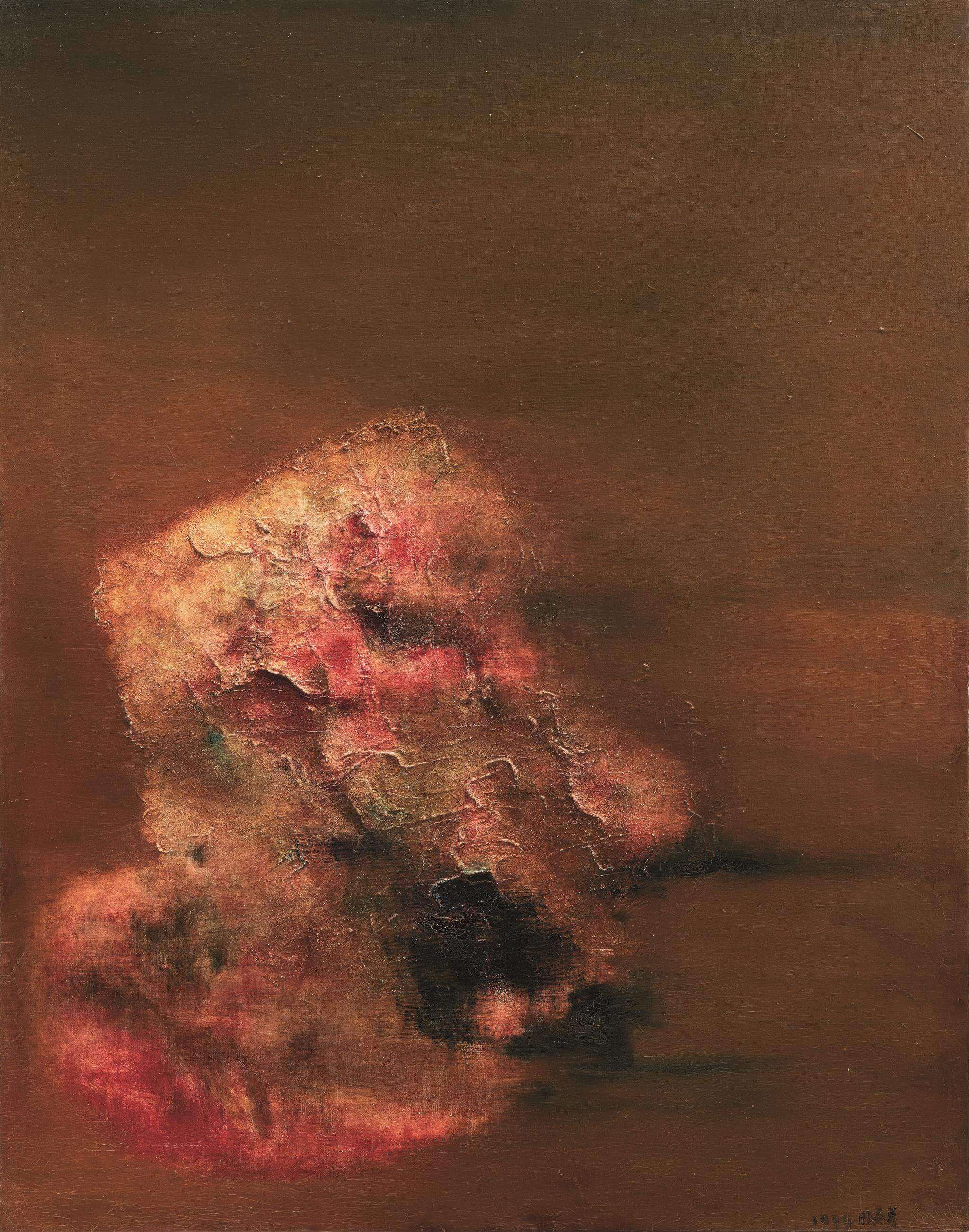 Created in 1999,Red Rock is an important exemplar of Zhou Chunya’s early Rock series. The artist was once deeply touched by the amazing landscape of red rock beach in Ya’an. Those rocks are full of grains on the surface and inspire him to create his Rock series since 1990s. The "red rock" even serves as the source of his later world wide renowned series of Peach Blossoms. In this work, the rock center is full of rosy red, grassy green and deep brown colours with thick and steady grains. Apart from shaping the large volume of the rock, this work also captures people’s attention to focus on the close combination of those vivid colours, which forms a rhythm of the swing between red and green hues, and the atmosphere of spring arrival. While the gradual slight colour at the bottom conveys a visual effect of regression, the bright tone on the upper left brings more lively warmness to the cold stone body. The emboss-like brushstrokes further retouch a texture effect close to life beings. The artist involves the western expressionism to the eastern calligraphy tradition, revealing the spiritual power imbued in the nature of rocks.