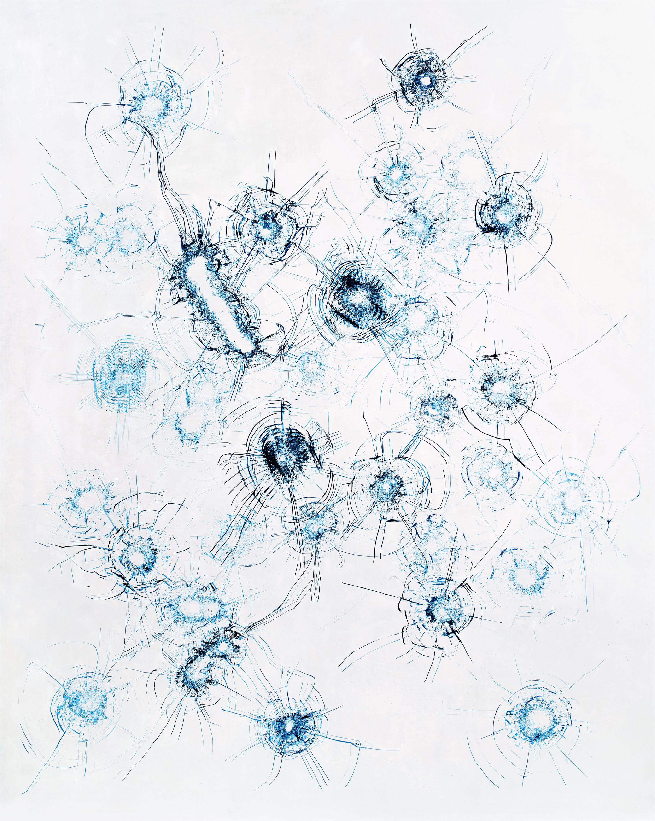 Zhao Zhao is regarded as an irresistible emerging force in the contemporary art world. Constellations presented this time is from the series widely praised by both the Eastern and Western academic circles and is the largest work of the artist in the market so far. The clean, sharp, and powerful lines generate the process of violence, revealing a sense of power on the brink of the outbreak. In contrast, the romantic name Constellations reflects individuals’ aspiration for security today. The huge contrast between theme and media center generates the transformation between violence and beauty, reminding the viewer to generate their free will.