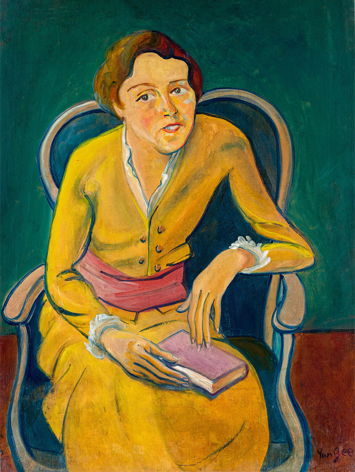 Portrait of Woman in Chair, which is going to be auctioned for the first time ever in this season, was portrayed by Yun Gee to love of his life, his first wife Princess Paule de Reuss, and was one of his most representative works in his Diamonist paintings. Moreover, Gee only used silk instead of canvas on a handful of works throughout his career, the material was sent by his mother from homeland during the war period, thus was a precious use Gee boldly employs Western oil colors and Western modernist spirit in the background. Indeed, the majestic use of dark green and brown over a large area and the artist’s resolute brushwork enhances the spatial dimensions of the work, utilizing the arrangement of light and shade in the colors to highlight the main figure in the foreground. The figure in the painting has gently placed a book on her knee, revealing that she likes reading. She is dressed in an elegant and graceful manner in a dress that has a "V" collar design with a broad waistband around her midriff, a popular fashion in late 1930s Paris. Although later life pressures forced them to part they remained best friends for the rest of their lives. Despite later remarrying, they still cared about each other, the artist’s left his love and affection on his work, and had kept this reminiscence ever since, as well as his sparkled talent during the war period.