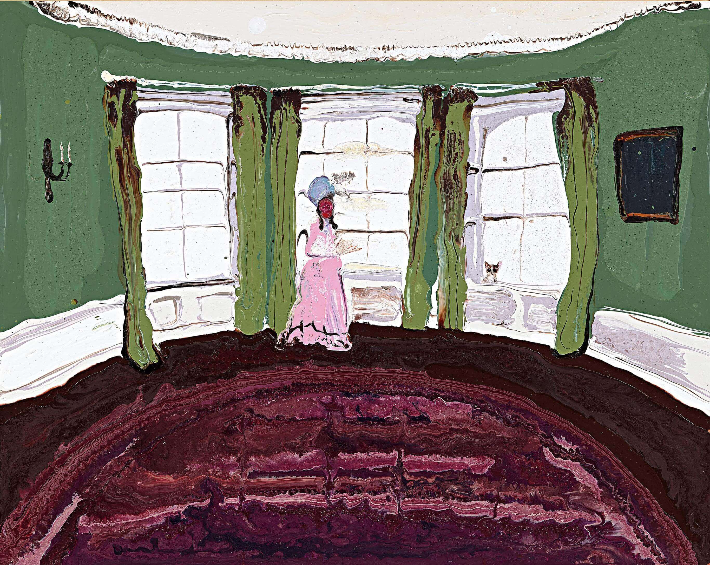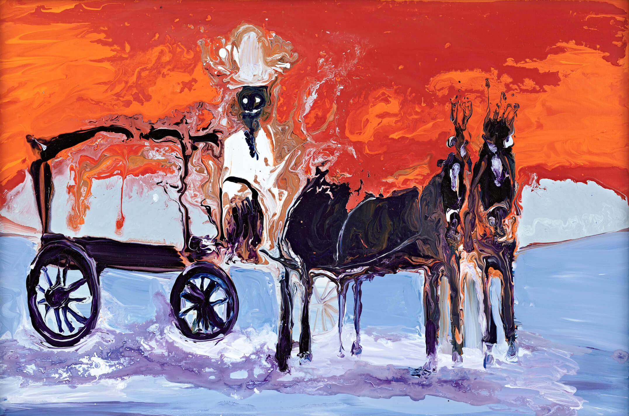 As one of the most welcome contemporary artists, the Irish artist Genieve Figgis specializes in transforming luxuriousness Rococo style to romantic life scenes. Carriage (2015) is as a salute to The Black Countess by post-impressionist master Henri de Toulouse-Lautrec. She plays fully subverts the traditional aristocratic scene, by replacing the nobility with “working class” carriage driver, alluding to the class contradictions. In the background, the whirl wind-like brush strokes depict an orange-red sky, as if melted flames are about to drip on the ice blue ground. In addition, the coach and driver are completely distorted, as they have been through a turbulent storm. The outline of the figure is surrounded by an earth-yellow pigment, almost as if blended with the flames behind, and this imbues the painting with a flamboyant resplendent style. It could be a warning of an impending revolution and the tense depiction instantly grabs the viewer’s attention.