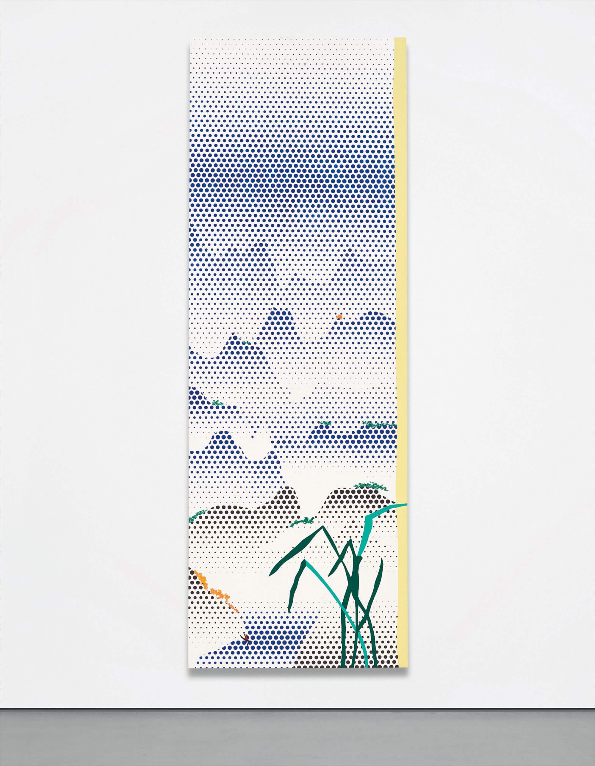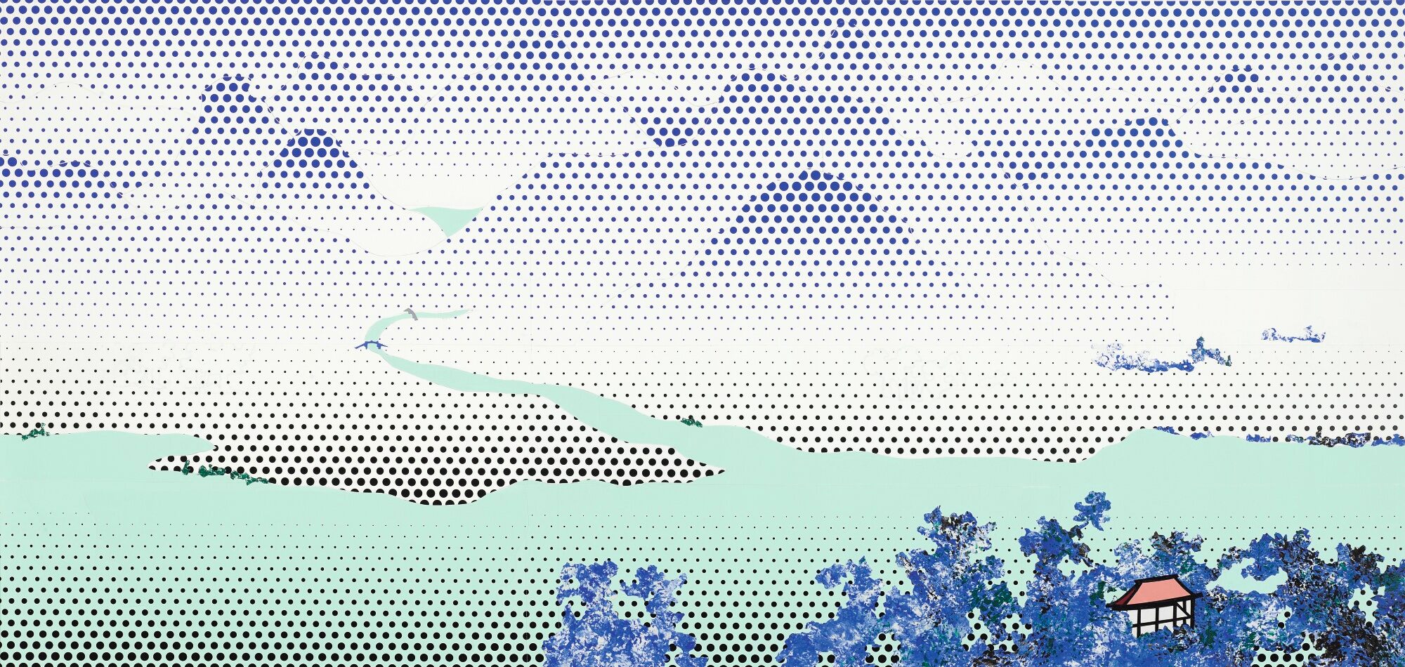 In the middle of 1990s, Roy Lichtenstein become interested in the Song Dynasty landscape paintings, and used Western painting techniques to depict the Eastern subjects. These paintings reproduced traditional Chinese landscape theme: cloudy mountains, twisted pine trees, bridges and rivers, old man in crutch and man fishing on boat.