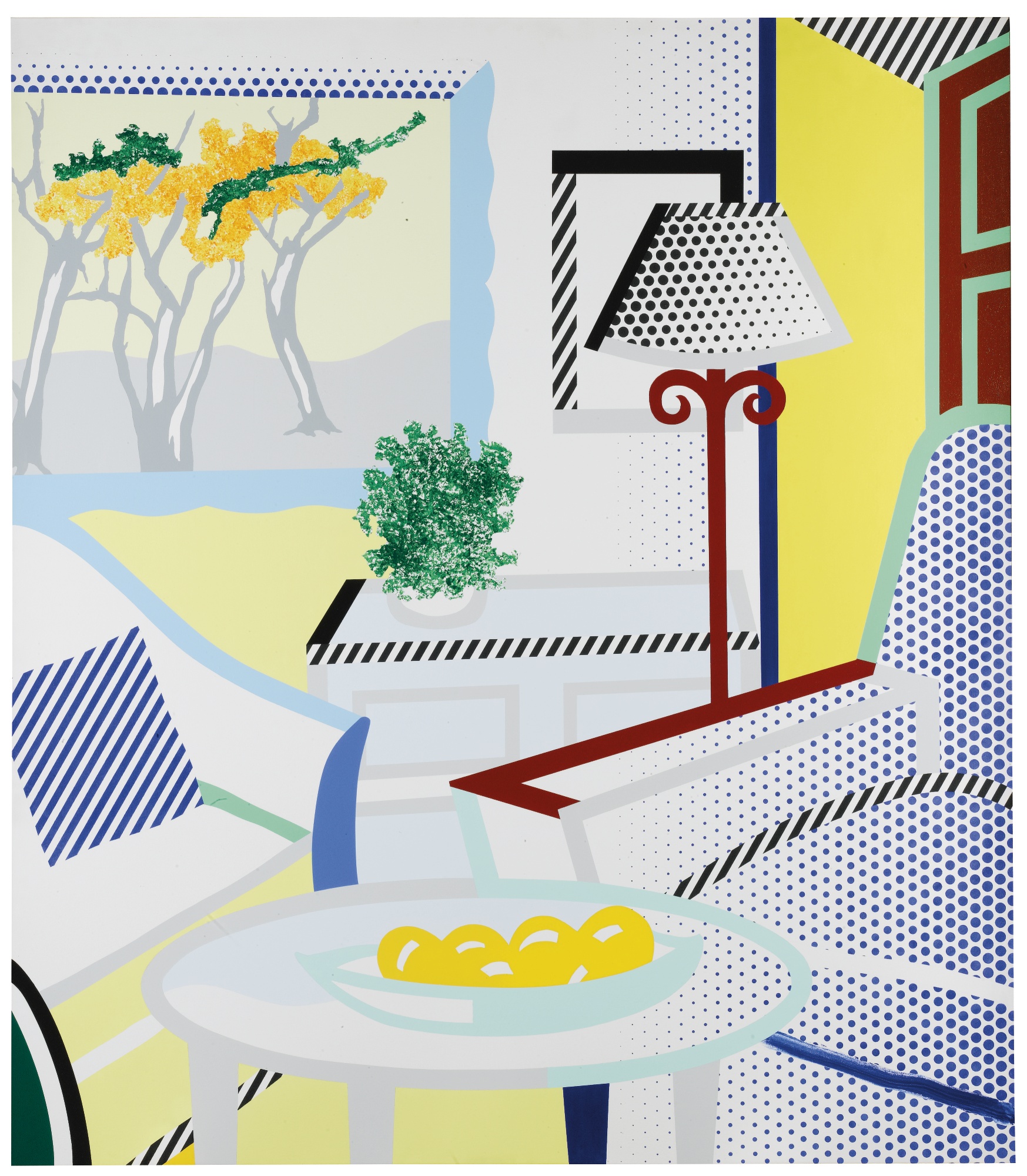 Roy Lichtenstein turned his focus to interior decoration at the beginning of 1990s. The image he used here is an ordinary mid-class bedroom, everything is solid and over neat, nothing but a symbol of place for living. There are no shadows on image, the space has nothing creative. The Ben-Day dots, aligned lines, the primitive and secondary colors also emphasized this affect.