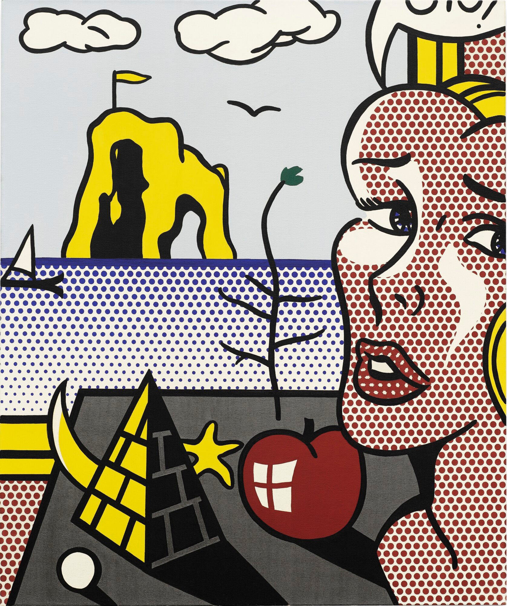 Roy Lichtenstein created series of paintings in 1977, based on the works of surrealism artists (include Salvador Dali, Max Ernst and Joan Miro) and some surreal works of Picasso. He still used Ben-Day dots in the creation, and adjusted brightness by changing tones of the dots. Landscape with Figures is an oil painting in 1977, a Henry Moore’s sculpture liked figure with red lips of a woman and a strand of hair that forms a head portrait in surrealist style. A huge signature brushstroke with clear outlines of his 1960s style is on the background. This repeating of theme has solidated the image system of Roy Lichtenstein.