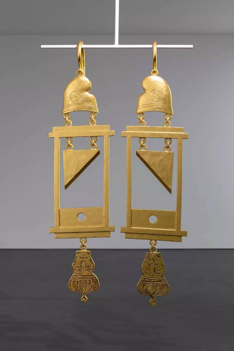一對描繪瑪麗·安托瓦內特和國王路易十六被砍下頭顱的戲劇性放大金色斷頭台耳環