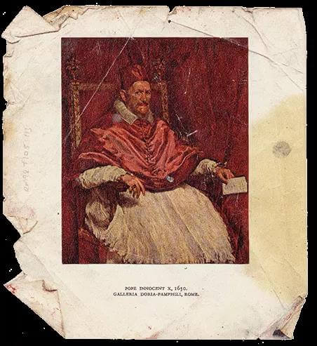 他以粗放有力的筆觸勾勒出畫面中教宗下身穿著的白色長袍線條,長袍垂落在綠色背景中所創造出的空間感,使畫面中的人物在平面與立體間取得平衡。此時藝術家告別1950年代初期教宗系列作品陰暗的背景,開始吸收較鮮豔色彩背景的調色筆法,而在其創作邁入巔峰時期的1960年代所創作的多幅鉅作中均可見這樣的背景用色。