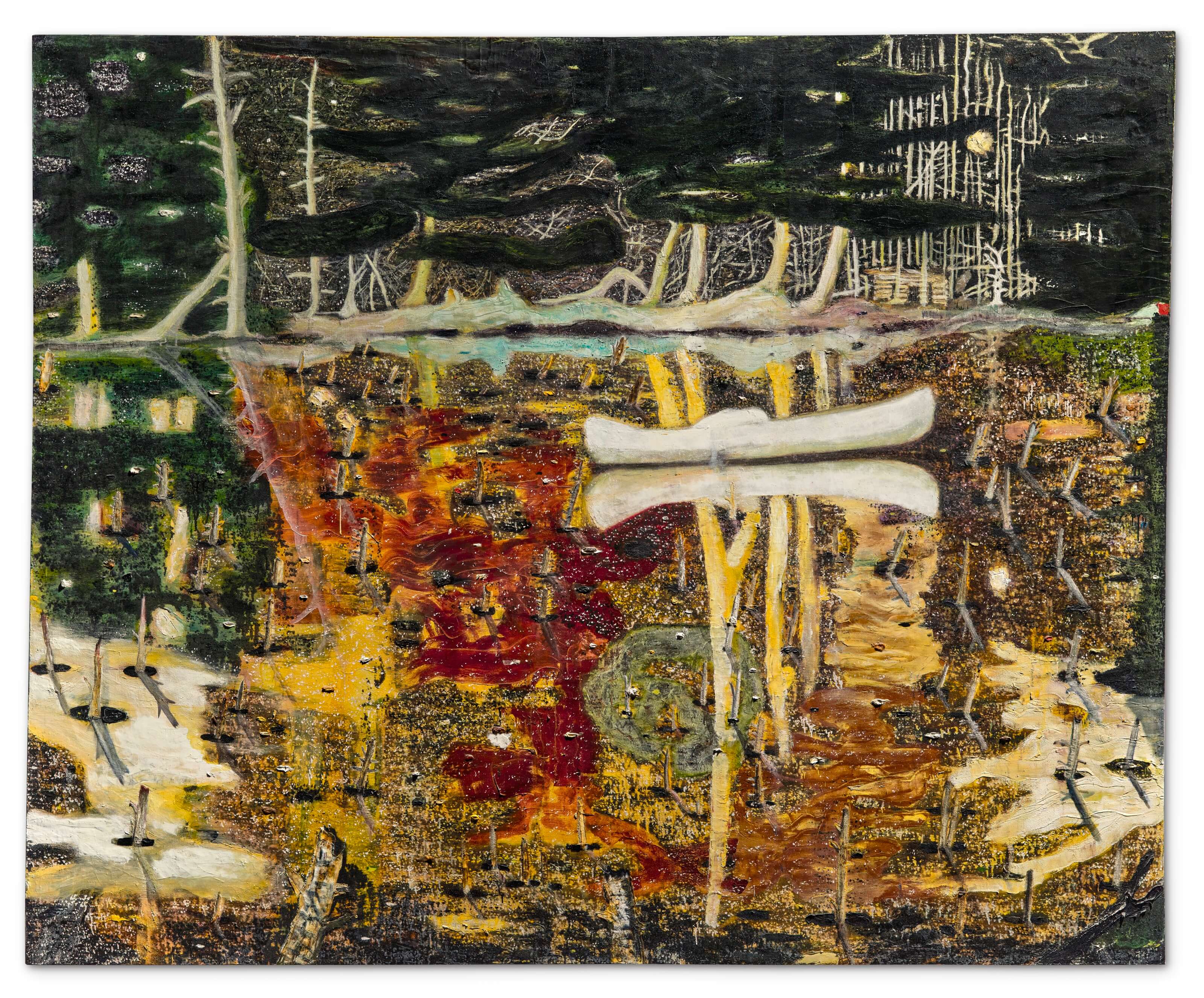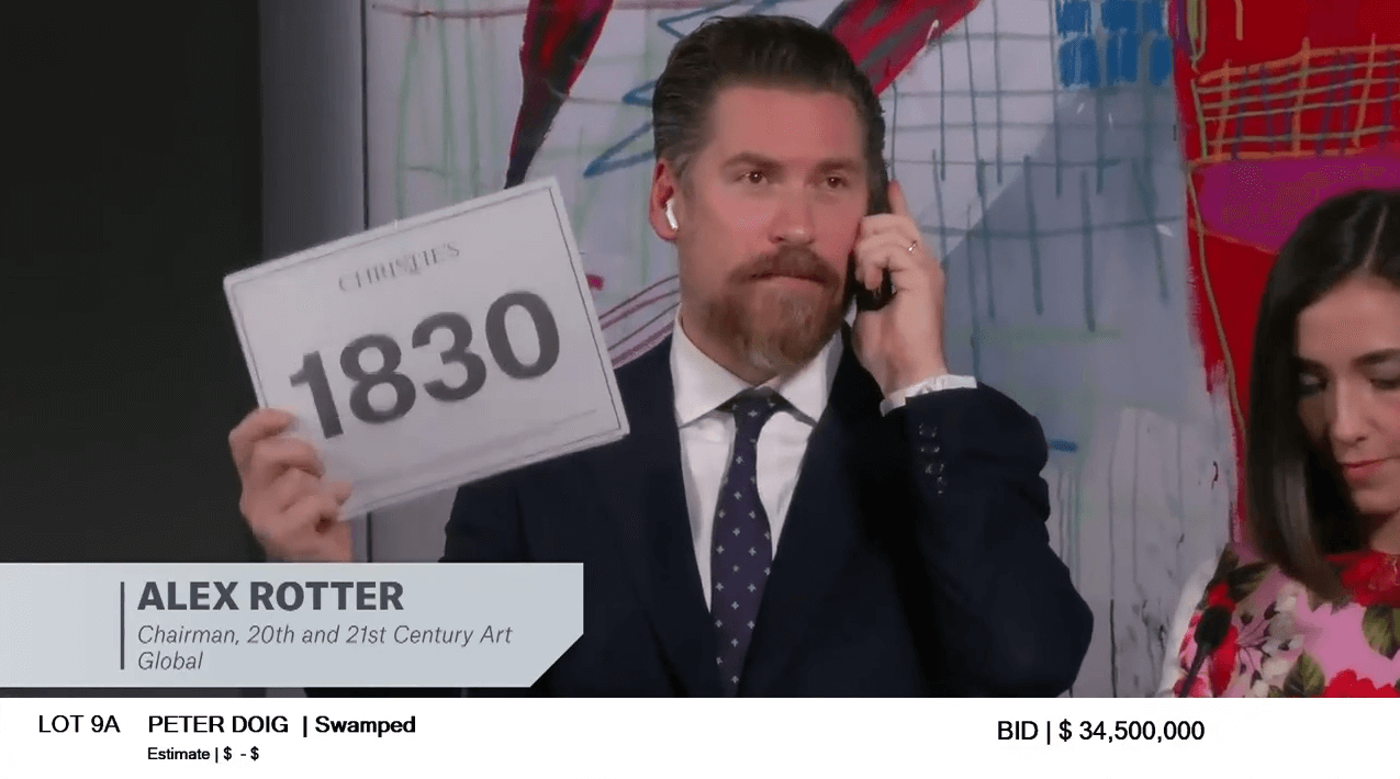 彼得⸱多伊格《泥沼》以39,862,500美元成交、1830號電話委託投得,刷新藝術家個人拍賣紀錄,打破了2017年5月《羅斯戴爾》在富藝斯紐約以2881萬美元創下的紀錄。 《泥沼》是多伊格最早的獨木舟繪畫系列中的一幅。對多伊格而言,小屋與獨木舟不僅是遷徙生活的回憶和隱喻,更是他試圖戲劇化記憶本身運作的載體。