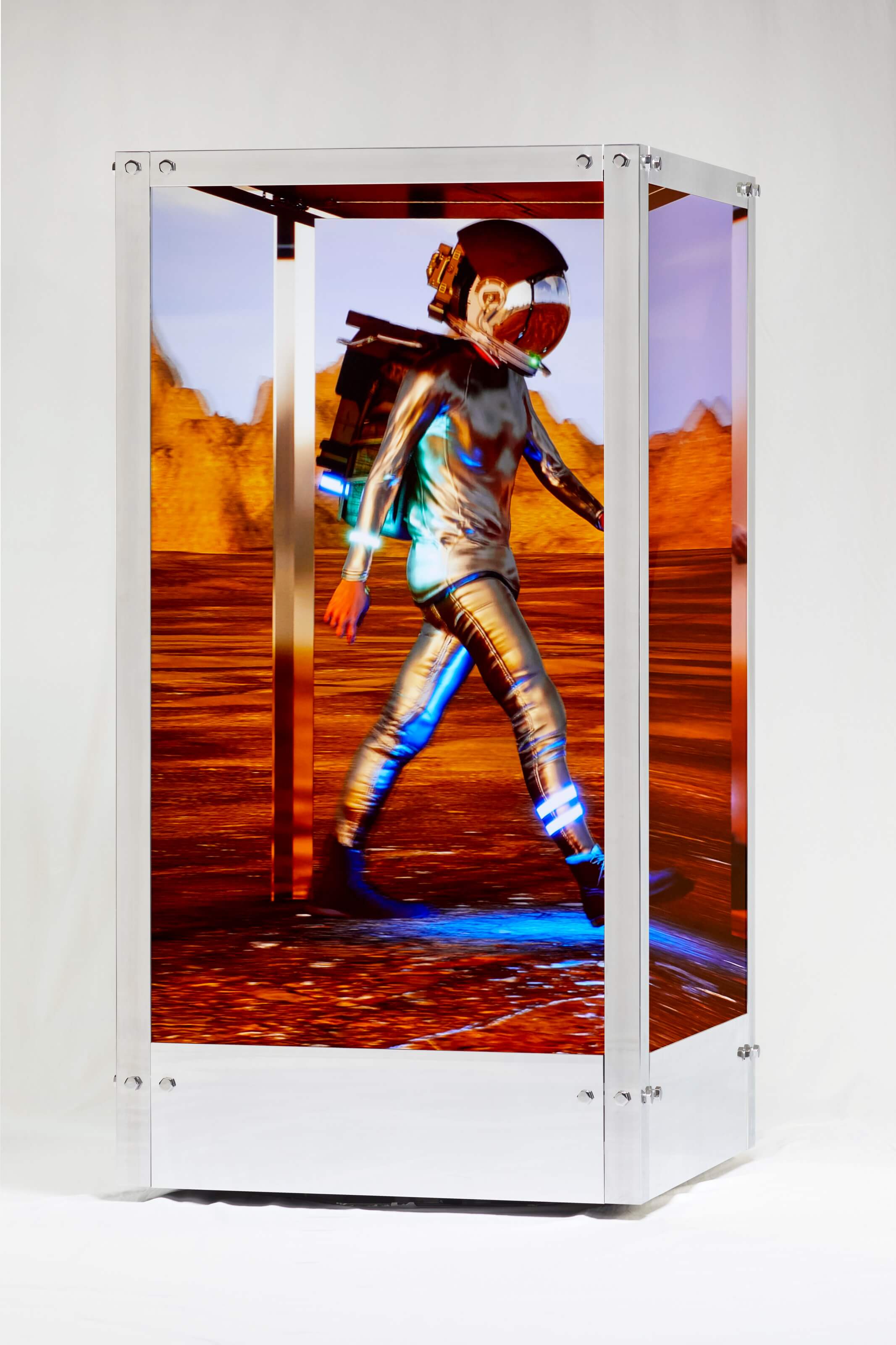 雕塑超過 7 英尺高,底部連接電腦,讓屏幕播放一位外形類似太空人的無名英雄影片——即戴著頭盔的《人類一號》。影片中的主角無視永無盡頭而又徒勞無功的薛西弗斯(Sisyphean)式命運,在這不斷變化的反烏托邦風景中,有節奏地邁向前方。