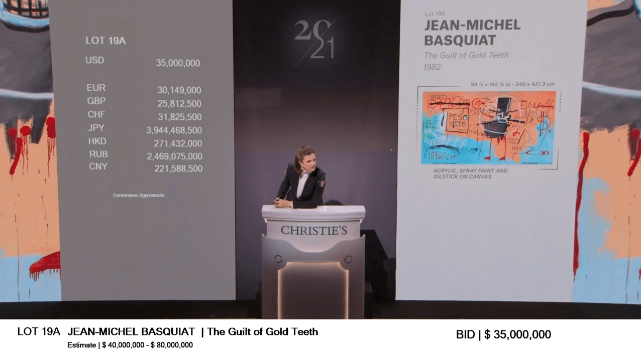 快訊,2021年11月9日,佳士得紐約本季盛大的「二十一世紀藝術晚間拍賣」白手套,40件拍品悉數成交,總成交額達223,827,750 美元(近14.31億人民幣),本場成交之冠為尚⸱米榭⸱巴斯奇亞《The Guilt Of Gold Teeth》,此大尺幅鉅作以42,725,000美元成交、成為藝術家個人Top7的作品。 彼得⸱多伊格、尼古拉斯⸱帕蒂、拉希德⸱約翰遜、史丹利⸱惠特尼、芭芭拉⸱克魯格、肯尼⸱沙夫、希拉里⸱佩西斯、賈桂琳⸱亨弗里斯、伊西⸱伍德、程心怡諸位藝術家刷新個人拍賣紀錄。