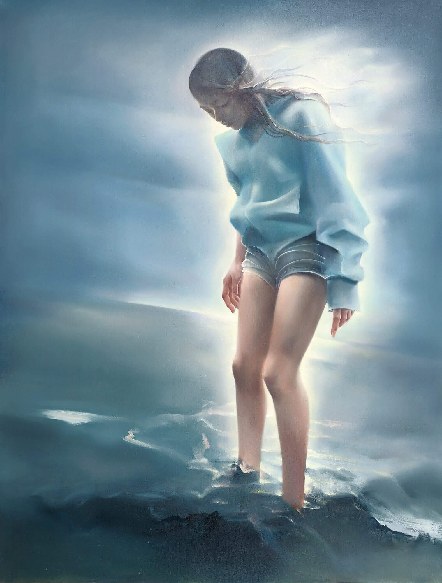 《踏浪》創作於2016年,是宋琨2015年“阿修羅淨界”與2018的“泛靈淨界”之間具有承接作用的關鍵性作品,整個畫面靜謐而幽遠。氤氳空氣以雲霧的方式縈繞、瀰漫於整個畫面,作為背景呈現出水藍色的空靈,下方被淹沒於海浪之下的山水之境如早些年創作的淨土風景,聚焦於泛靈之境的空無與寧靜。