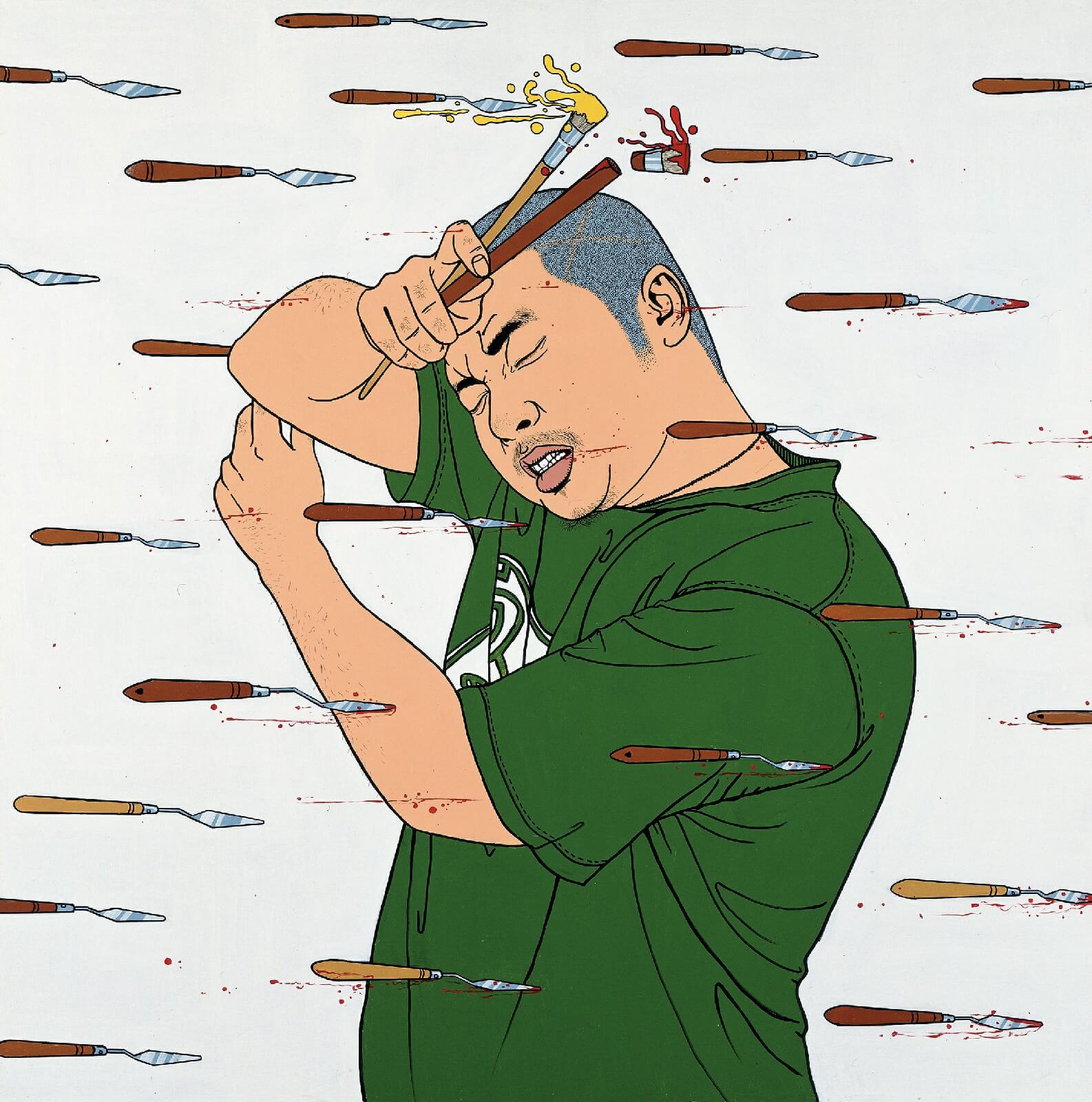 《還在畫畫》以110萬落槌、126.5萬元成交。 此拍品是陳飛2005年畢業後創作的作品,作品中除了藝術家一以貫之讓人忍俊不禁的冷幽默之後,也飽含藝術家對自身身份和繪畫的思考。