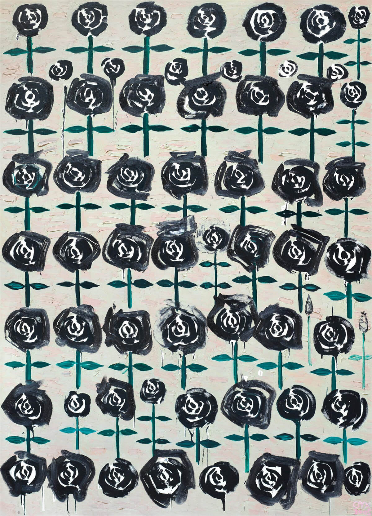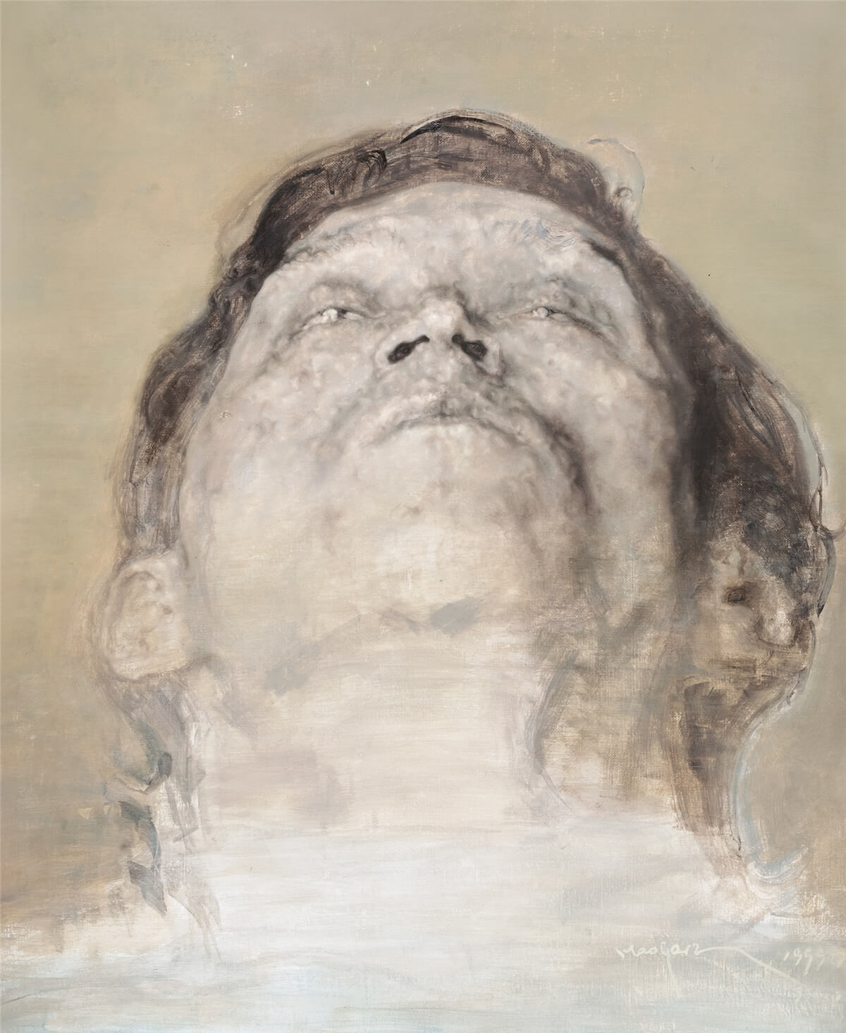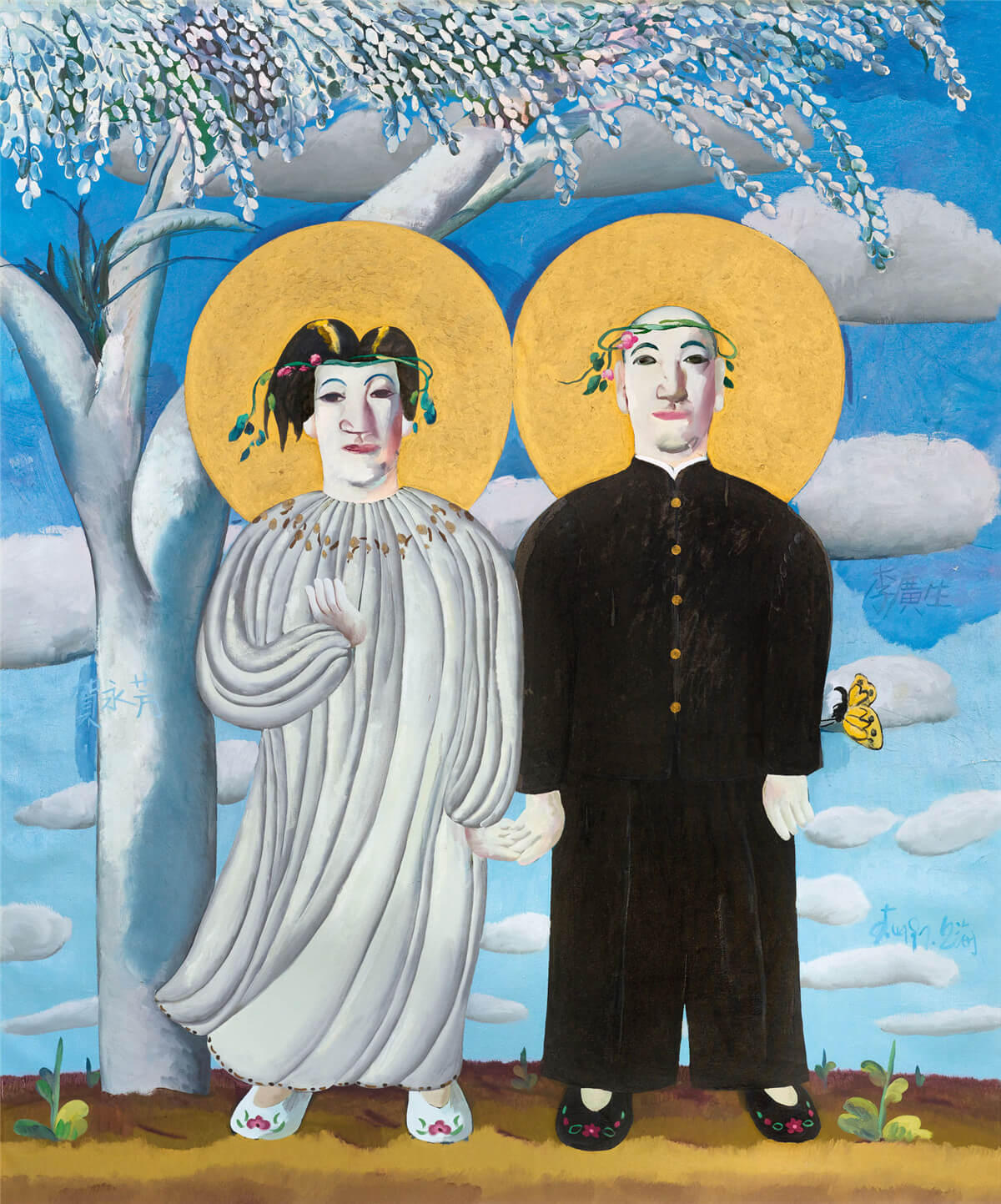 李山,85新潮運動的領軍人物,《李山1號⸱生命的邏輯》創作於1997年,是關於藝術家對父母的追憶,作品抱有較強的繪畫性,配色與人物造型精緻典雅,畫面中的人物標註了父親李廣生和母親賀永芳的名字,用等高的畫布,將父母重繪出來。