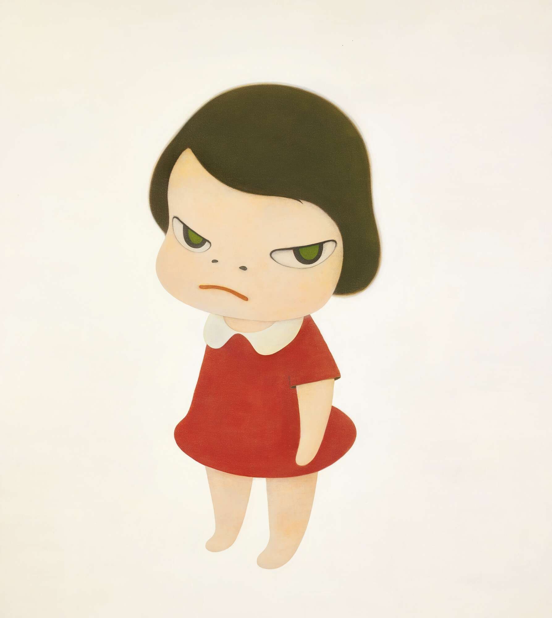 這一流派的開山人物,當屬奈良美智。那個吊著眼角、斜睨世界的大頭女孩形象,最為深入人心。最初,這個女孩凝聚了奈良美智客居德國期間的孤獨感。後來,他回到日本生活,作品中刀子、電鋸、手槍、棍子等物品逐漸隱藏甚至消失,小女孩的形像也趨向柔和。人物內在的戲劇張力卻得以保留和內化,形成了奈良美智連續風格下的不同表達。