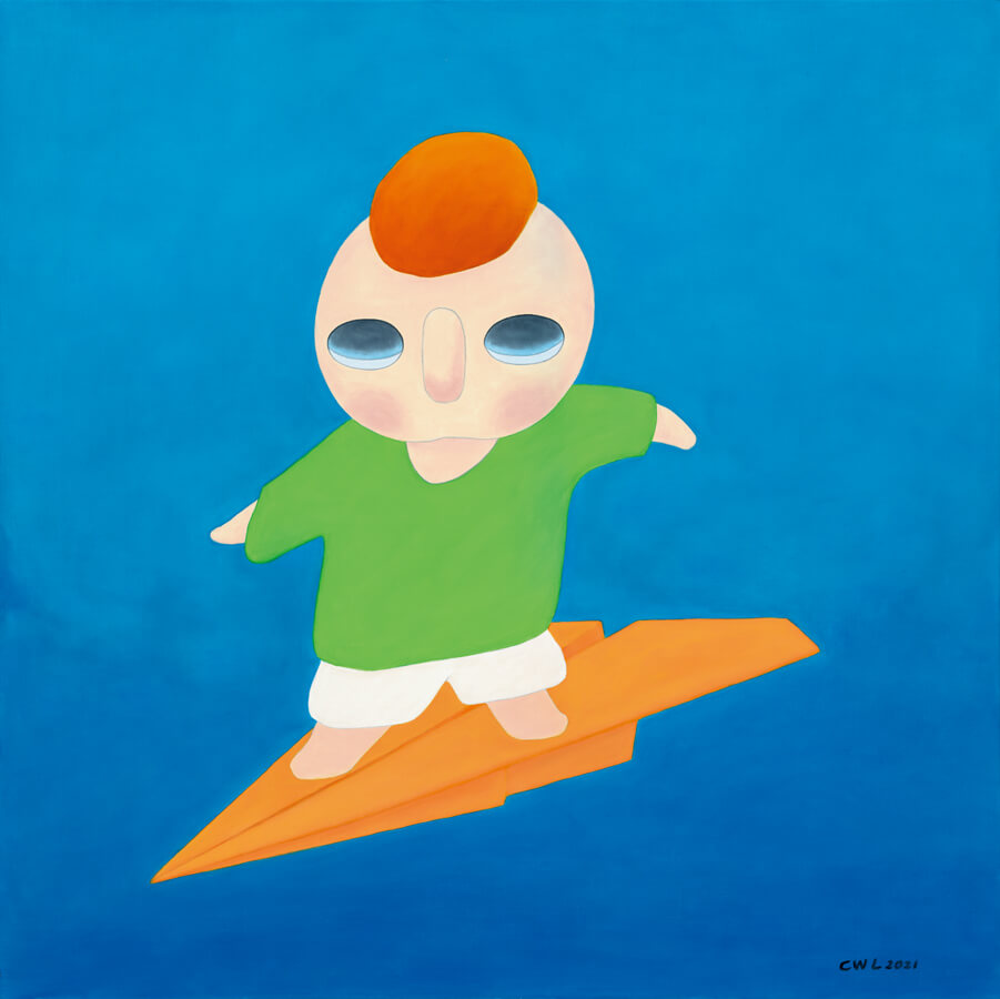 以2021年嘉德秋拍的《標準姿勢之四》為例,雙手插兜的yy,以放鬆卻無謂的狀態出現,很容易讓人聯想起當下的某種精神特質,而在華辰秋拍成交的《漂浮》,則是2021年的新作,站在紙飛機上的yy,容易讓人產生一種不穩定的懸浮感,紙飛機能帶著yy去向何方,都似乎呈現出獨屬於當下的迷茫。誠如蔡萬霖所說,“在每一個漂浮的泡影裡都有一顆不安的心”。