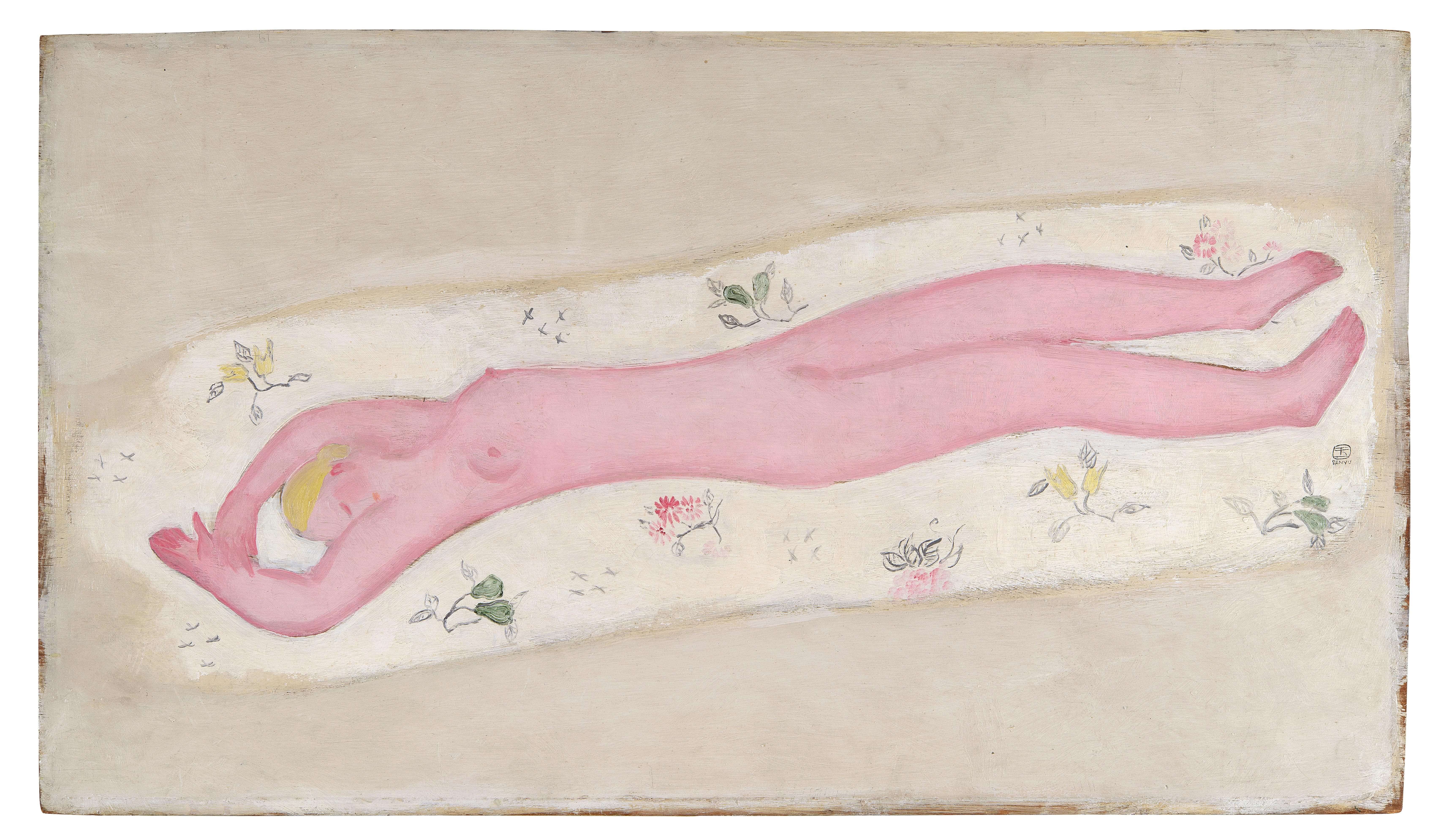 San Yu moved to Paris around 1920, and nude paintings began to be a frequent theme in his creation. Until his death in 1965, his nude women continued throughout more than 40 years. At first, he was deeply influenced by Chinese painting and calligraphy, he often used brush and ink to outline his paintings. In the 1930s, it was a pink nudes with strong sentiment, and in the 1950s and 1960s it evolved into a nudes with clear and thick outlines.