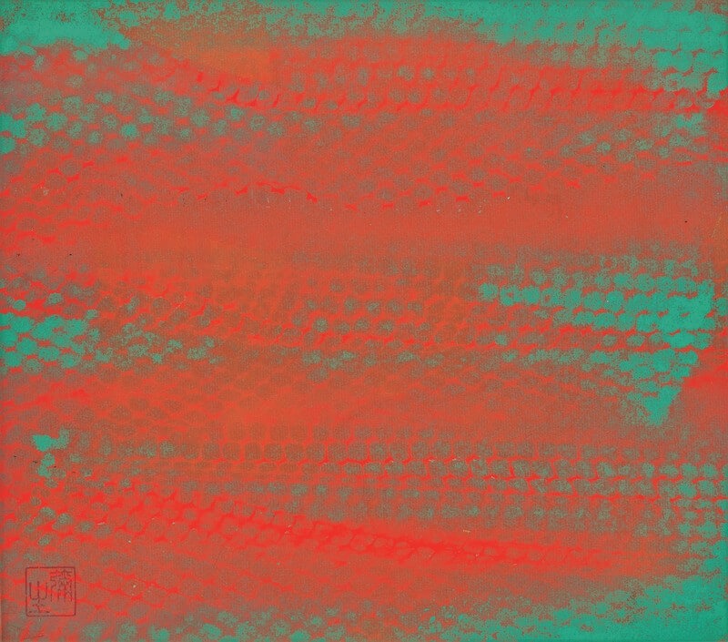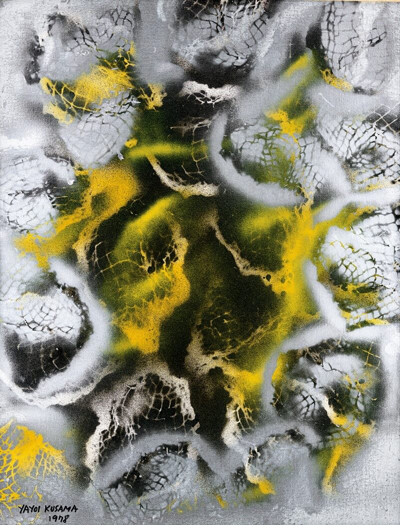 是次還將呈現藝術家四件精彩紙本之作,以大尺幅《星空的那方》領銜。 1978年,返日不久的草間回到家鄉長野舉辦個展,彼時冬日綿延的雪景深深打動了她,遂以「銀色磁釉」為媒材,創作出《星空的那方》,致敬心目中獨一無二的「故鄉的雪」。畫中流動的銀白色彩展現雪落下的動態感及,而黃色的星光由夜空中由中心往外溫柔擴散開來,展現強烈的詩意之美。 作品達65×50.5cm,有別於其他「瓷釉紙板」之作多為27×24cm的尺幅,令《星空的那方》不僅在時間上成為其「瓷漆紙板」系列的開端之作,更是該系列最大尺幅作品之一,顯示珍罕絕倫的收藏價值。