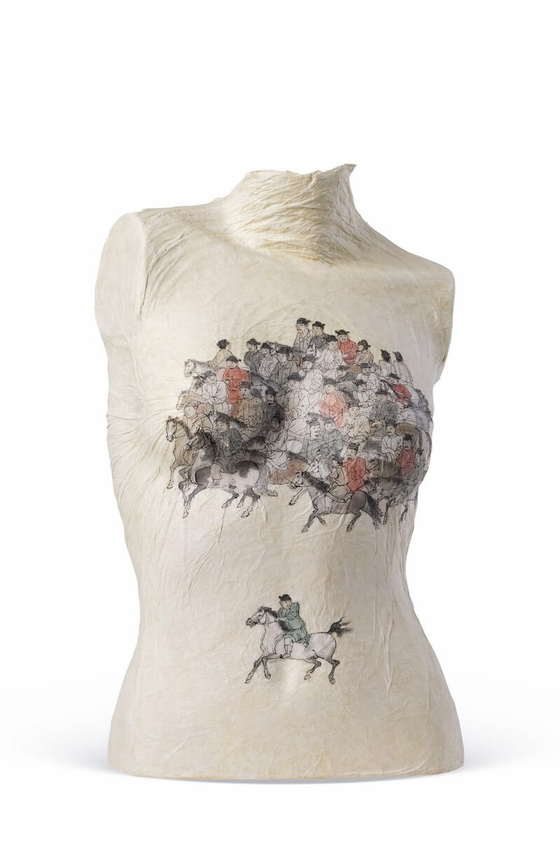 《牧馬圖之二》曾四度展陳於彭薇個展及重要聯展中,顯見其於她創作生涯中的要義。 在此,以紙漿塑形的女性身軀提供了一個關乎歷史事蹟的形的構架,再現「牧馬」一事的盛大場面。畫中36位男性騎手如若從唐代壁畫《章懷太子狩獵出行圖》中奔踏而出,熱鬧非凡。畫作僅以紅、青、墨色調水暈染,人物的外貌、服飾、情態無一重複,群像薈萃,神韻獨具,令人驚嘆。彭薇欲藉此作言說那些「不在埸的女子」仍胸有丘壑,欲在天地中狩獵、奔馳、追索的自由懷想,在古今對話中,引人深思。