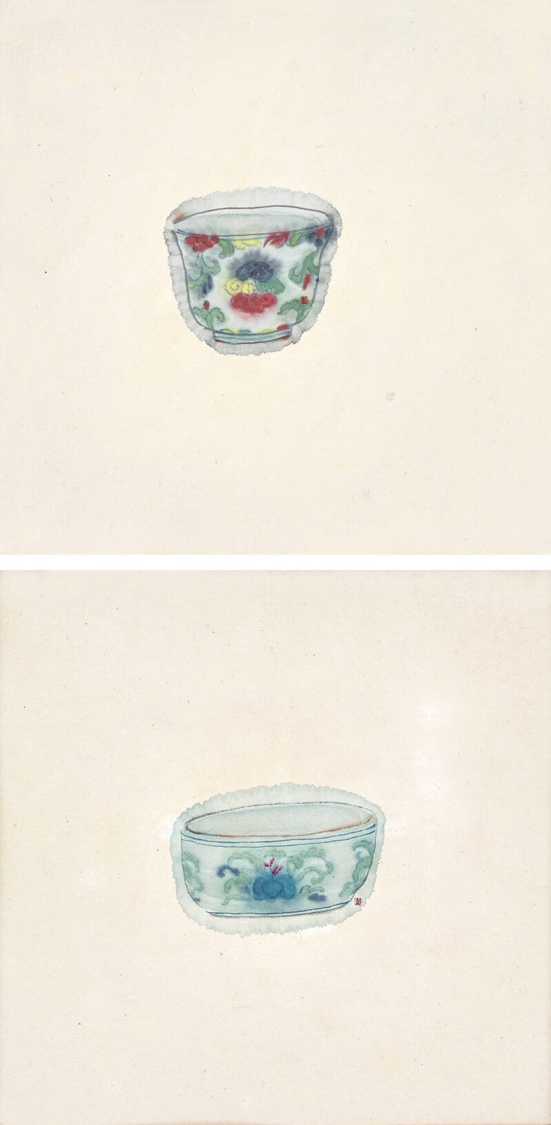 而在《鬥彩杯》(一組兩件)中,彭薇以北京故宮博物院收藏的兩隻明代鬥彩杯為對象物,布構一方天地。當中「鬥彩靈雲紋杯」,以玄青墨色精細勾勒青花輪廓,杯腹的團形靈芝紋,伴以紅、黃、綠、墨四色釉上彩,藉濕筆暈染,浸透而現瑩瑩光輝,遠觀如祥雲籠罩。而「鬥彩折枝花紋淺杯」則體現少有的淺弧腹敞口杯,體態敦厚圓潤,古雅大方。