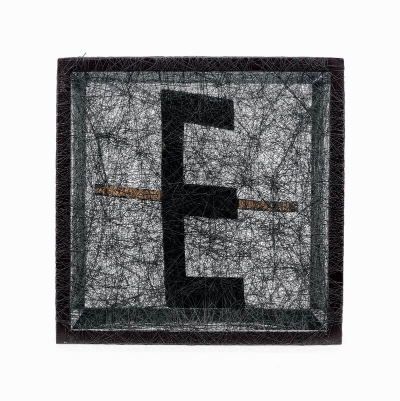 而《鐵路平交道號志》則罕見地選用鐵路符號金屬方向標誌「E」作為核心主體,加以細密交錯的黑線圍裹。黑線如同一方深邃的夜空,在三維空間中發揮若黑色畫筆般的強烈表達性,絲絲纏繞的線條,彷如不同的人生軌跡或不斷向外延展的時空。作為上世紀鐵路方位指向的標誌,「東南西北」簡潔而醒目的字母別具意義,此作中的「E」字即代表的「東方/East」,鹽田以此隱喻時代前進的不息步伐,並指涉個人民族的出身,意圖在此「日昇東方」的指引中,探索藝術與文明的前進方向。