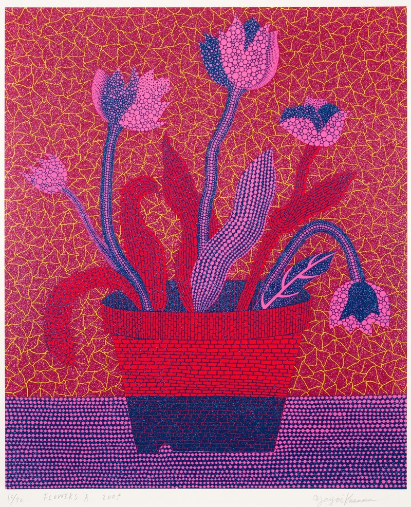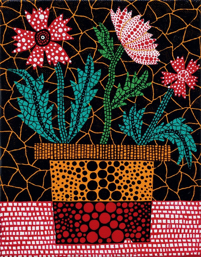 草間常以「花」自喻並將之入畫,當中兒時在外公的苗圃養殖場中常見的紅白「日日春」即為貫串她創作的客體。 完成於1996年的《花》即為箇中經典。 在深黝的背景中,黃色的無限網紋若閃電般打破黑暗的靜默,射出光線,帶來大地的光耀。鋪著格紋布的桌案上,在那帶有躍動的圓點若暗示紅土養分正向上輸送的方形盆器中,三朵花兒瀲灩綻放,草間細膩地在葉脈和花莖上作精密的網紋描繪,花朵大張旗鼓地吸收天地的精華,歌頌生命的壯美。作品中的用色宛如音韻般平仄相對,如背景的黃黑呼應盆器中區的色彩,花兒的紅白呼應桌布的用色,方寸之間暨和諧又飽含奇趣。畫中的長春花性耐乾旱貧瘠,具強大生命力,除為草間最熟悉的花朵,其堅韌的特性也呼應了草間的性格,正如她自言,自己在海內外闖蕩中企圖開出一朵「艷紅的花」,增添此作的深意。