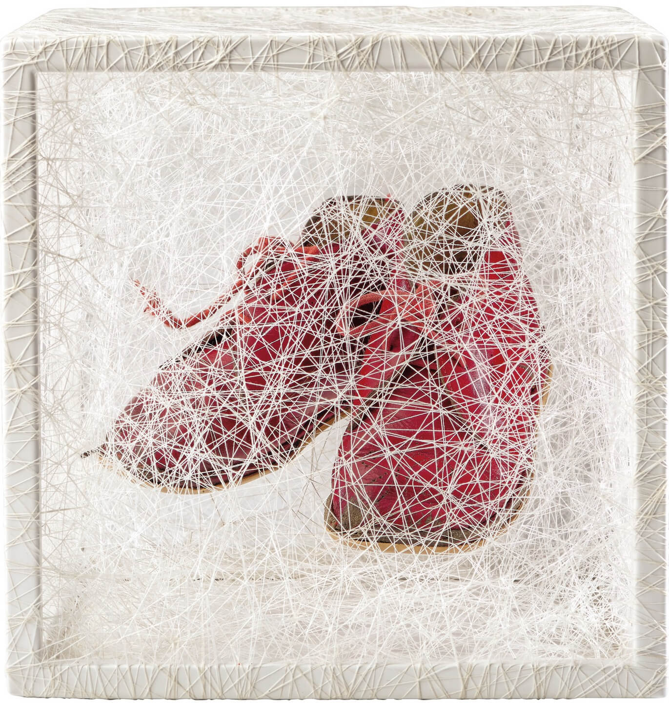 放眼現今日本當代藝壇,鹽田千春近年無非是在草間彌生之外,於學術界與市場討論熱度最高的女性藝術家。 《存在的狀態(鞋子)》以對藝術家而言代表「純真與重生」千絲萬縷的白線承托起一雙帶蝴蝶結的小紅鞋。 歷經歲月洗禮的鞋子在此離開主人腳下,可令觀者自然連結到它曾「行走」過,在不同時空的記憶留痕——許是剛上幼兒園時,帶著興奮又有點膽怯的心走入人生第一個求學場域,又或是成年後趕赴約會的步履匆匆⋯⋯可能蘊藏的故事交由觀者去推敲和想像,進而令人捕捉到身體感知與心理狀態之間的幽微牽動,喚起與自身記憶所延生的內在對話。
