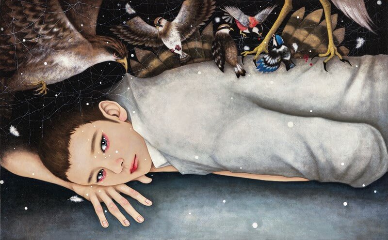出生於北海道的飯田桐子以綺麗又富日本幽玄美學的風格備受藏家追捧。 《箱庭之鳥1》為其創作經典。 在日文中,「箱庭」意為庭院式盆景,後被引申為「小世界」,透過精妙設計的小型空間援引廣大的自然。畫面中央,一姿容姣好的清秀男子俯臥於飄雪的冰面,被動物所環抱,細節豐富,充滿擬人式的寓言,男子優雅的體態,堅毅的眼神如放下刀劍的俠客,在那純然又玄奇的畫境,令人顧盼再三。