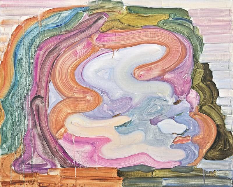《擦身而過的困惑2019-128》出自在一級市場一畫難求的江上越,師從劉小東、就讀於中央美術學院博士班的她,以「人臉」為主題,通過瞬息萬變、充滿活力的筆觸,繪出一道肖像的「彩虹」。 畫中她以如虹彩猷勁的線條勾勒出一短髮少女,通過捲曲的線條,可見她圓潤幼嫩的面龐,微閉的雙眼流露出不諳世事的神態。儘管少女的表情透露著疏離,畫面卻以柔和的橘、粉等暖色調構築出生活情味,令人瞬間為眼前的恣意線條所環抱,敞開心扉。