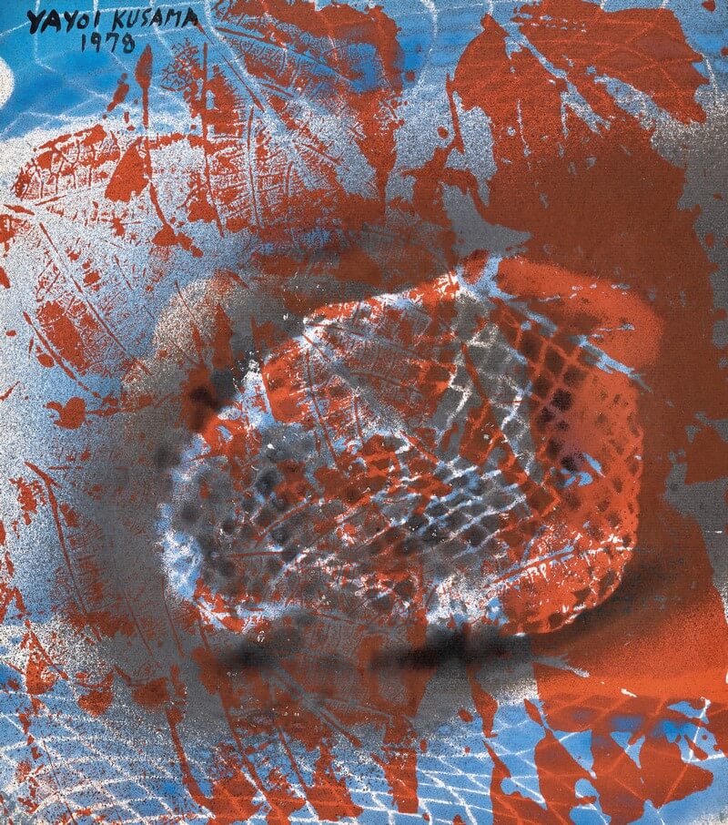 而完成於同年的《海底的傳說》,在湛藍如海的背景中,上下兩區星羅棋布的格狀線條時高時低,中心錫灰色中緊湊密集的網狀格紋成為一凝聚的晶體,如同海底神秘晶燦的寶石。引人步入一個未知的海底世界。而畫面的表層,罕見地出現了以樹葉沾抹橘色壓克力彩後壓印的痕跡,手法甚少出現在草間同系列之中,突顯此作的特出。