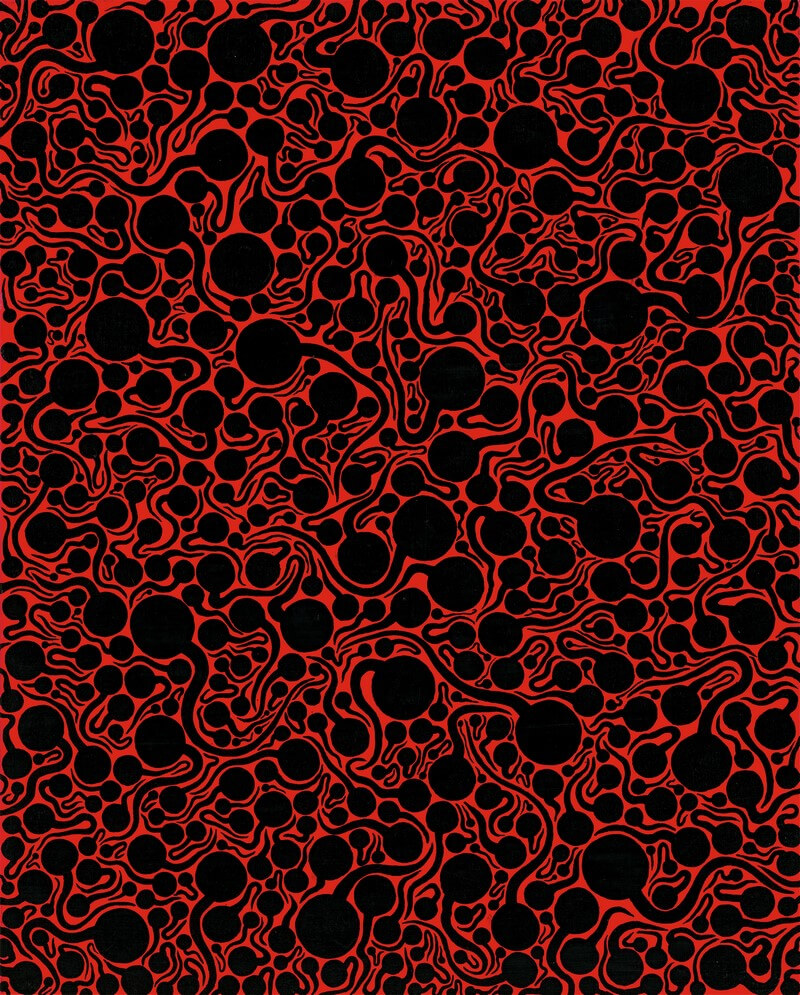草間自60年代末起便藉行為演出,提出對「反戰」、「愛」與「性解放」的宣言,直面肉體、慾望等議題,然而在平面畫作上,她多采取隱晦的抽象手法,然而在《夜的靈魂》中,她大膽將畫幅施以若帶有生命脈動力量的紅彩,在其上將對她而言「和地球、太陽與星星形狀一樣,富有生命的圓點」添加上線條,生成大小不一如蝌蚪的浮游生物,或帶有希望象徵的豆芽,它們在炙熱的紅海中,鋪天蓋地以各自的節奏展現風姿,那迴旋、曲折的線條指涉其前進的方向,個別看它們彼此獨立,若生命存在的本質,廣而視之時它們集結成一個個充滿動感的迴旋之氣,示現著生命的旅程,讓人感受個體從初生、啟程,及那由複雜人際關係所交織成一片鮮活的生命圖景。 在完成此作的前年,草間在美舉辦大型回顧展,首次登上具高度影響力的《美國藝術》(Art In America)雜誌封面,為首獲此殊榮的日本藝術家,《夜的靈魂》無疑體現了草間彼時對生命與藝術成就熱烈的歡慶和頌讚,意義非凡!
