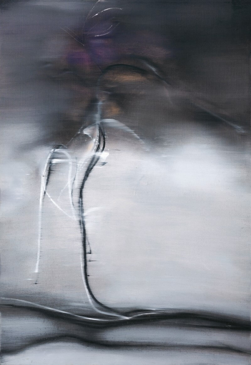 完成於80年代的《無題》,則融貫謝景蘭60年代的書法表達、70年代的山水構型、及如電子樂譜音律般逸動靈慧的巧思,彰顯其純淨的動人心音。 在此她突破性地將綿密勁道的炭筆線條貫穿畫幅中心,中央留下最為濃重的一道連動之筆,若盤虯臥龍,四溢的墨線則如聲波般隨之擴張,輕柔舒緩的水彩在其中延展,層層律動,充滿韻律之美。 有別於該時期創作多以藍、灰為主色,《無題》罕見地以鮮明溫暖的鵝黃暈染著色,展現開闊明朗的生命空間。將東西美學、舞樂詩畫渾融為一,吟詠著廣博的無垠之象。