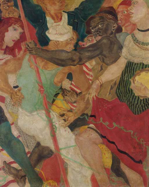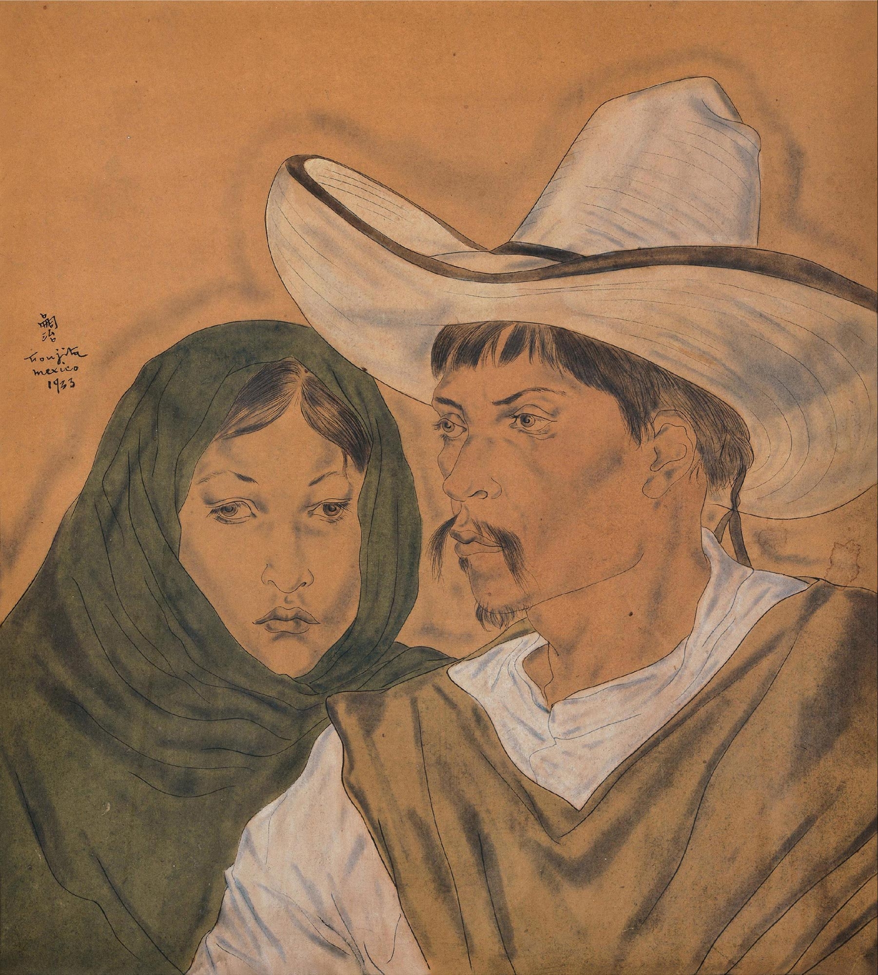 After successfully gained attention with the milky white nudes series, Foujita started on an immersive journey across North America, Central and South America and Asia in 1930s, that has temporarily take him out of the milky white world, the artist began to wander in those brightly colored worlds. During his travels in South America, he adjusted his works to the local colors and his style of painting had changed for a time. Crimson, green, and blue that had not been used before now appeared on his canvas, and the lines of ink from the past had disappeared.