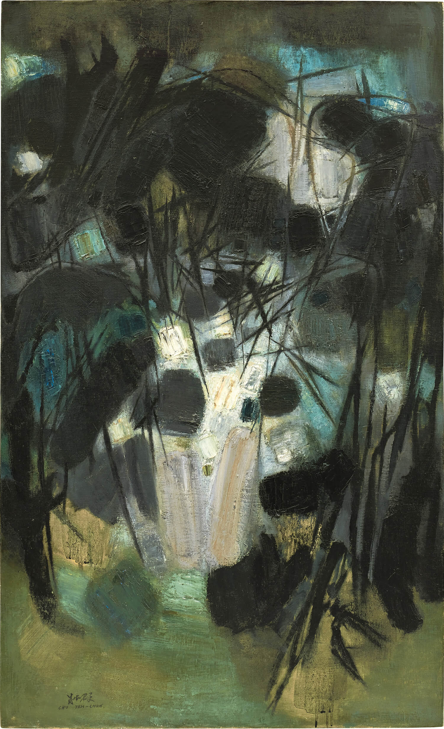 Painted in 1960, a year which is considered to be the apex of Chu Teh-Chun’s career when he transformed his oeuvre from the representational to the abstract, Composition No.65 (illustrated page 1) is representative of the artist’s early abstraction period. The present work epitomises a vertical format which emphasises the artist’s references to scroll-mounted Chinese classical landscape paintings. With canvas as a basis and oil as his medium, Chu perfectly translates a cornerstone of Chinese tradition using the most Western form of expression, advancing a quest for the renewal of Chinese art that characterises the golden decade of the 1960s.