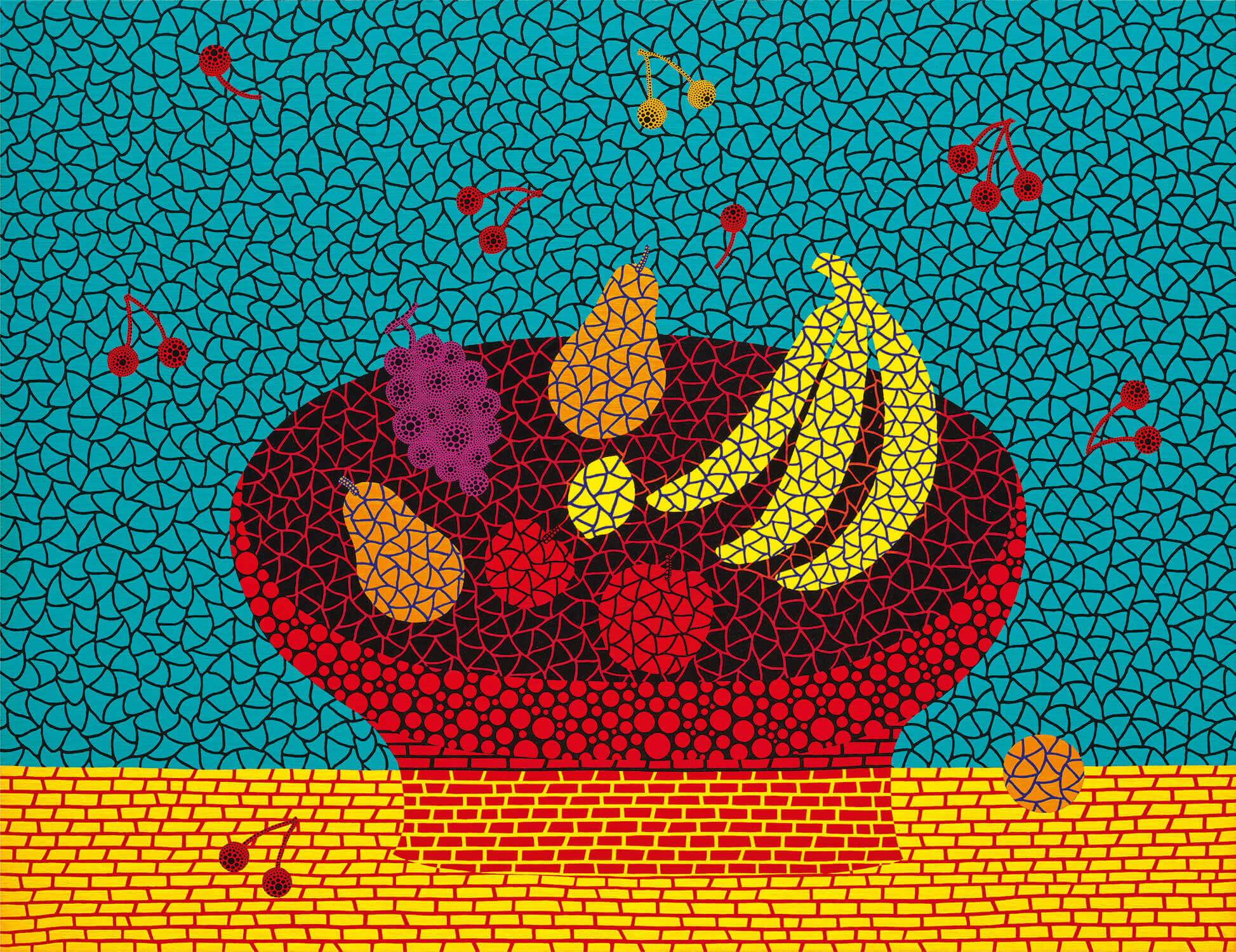 Yayoi Kusama’s lifelong fascination with the natural world began during her childhood when she spent time in the seed-harvesting field of her family’s plant nursery. Fruits [EPSOB], 2011, is a signature still life painting of fruits obsessively filled in with the artist’s most iconic motifs: her infinity net pattern, polka dots and lines.