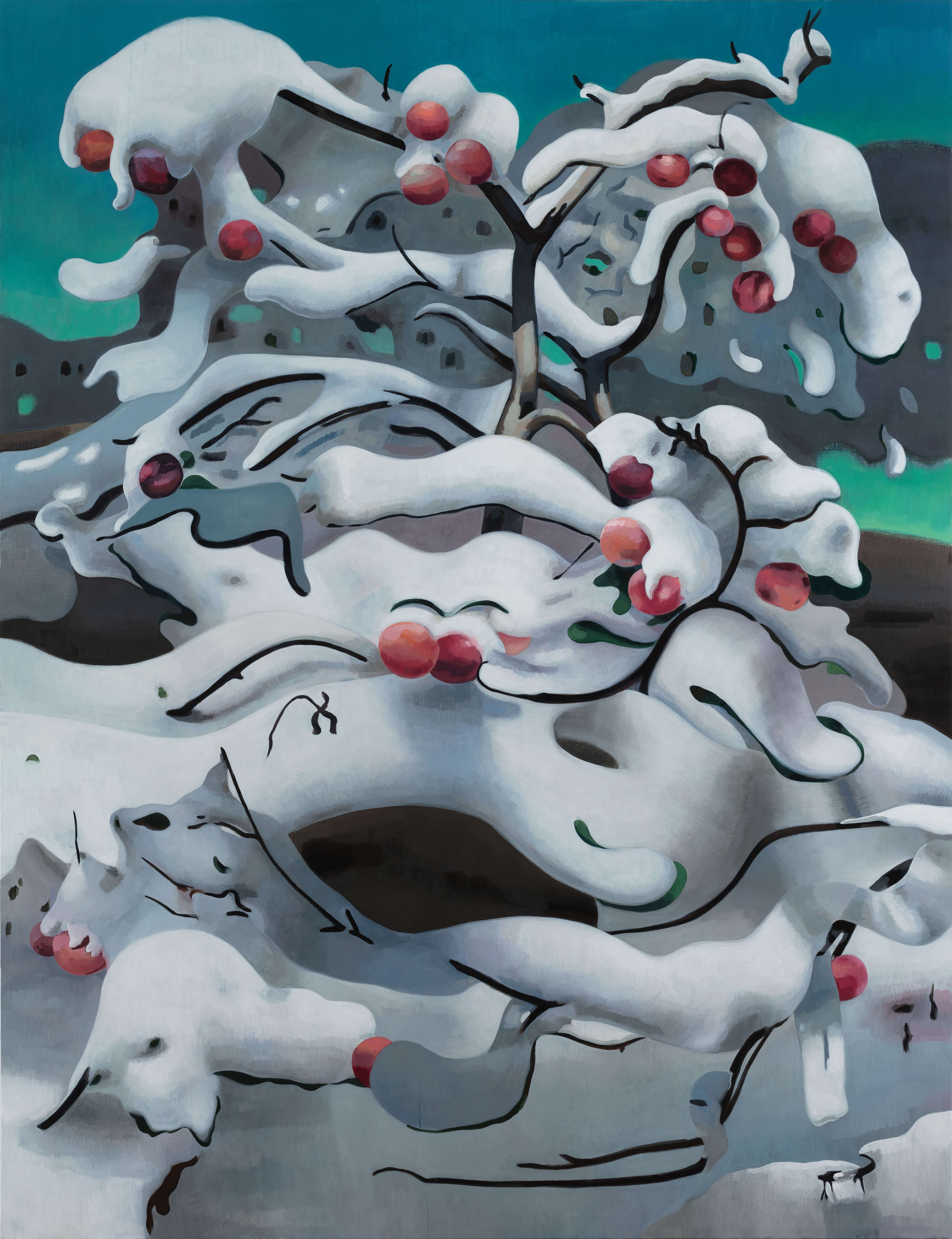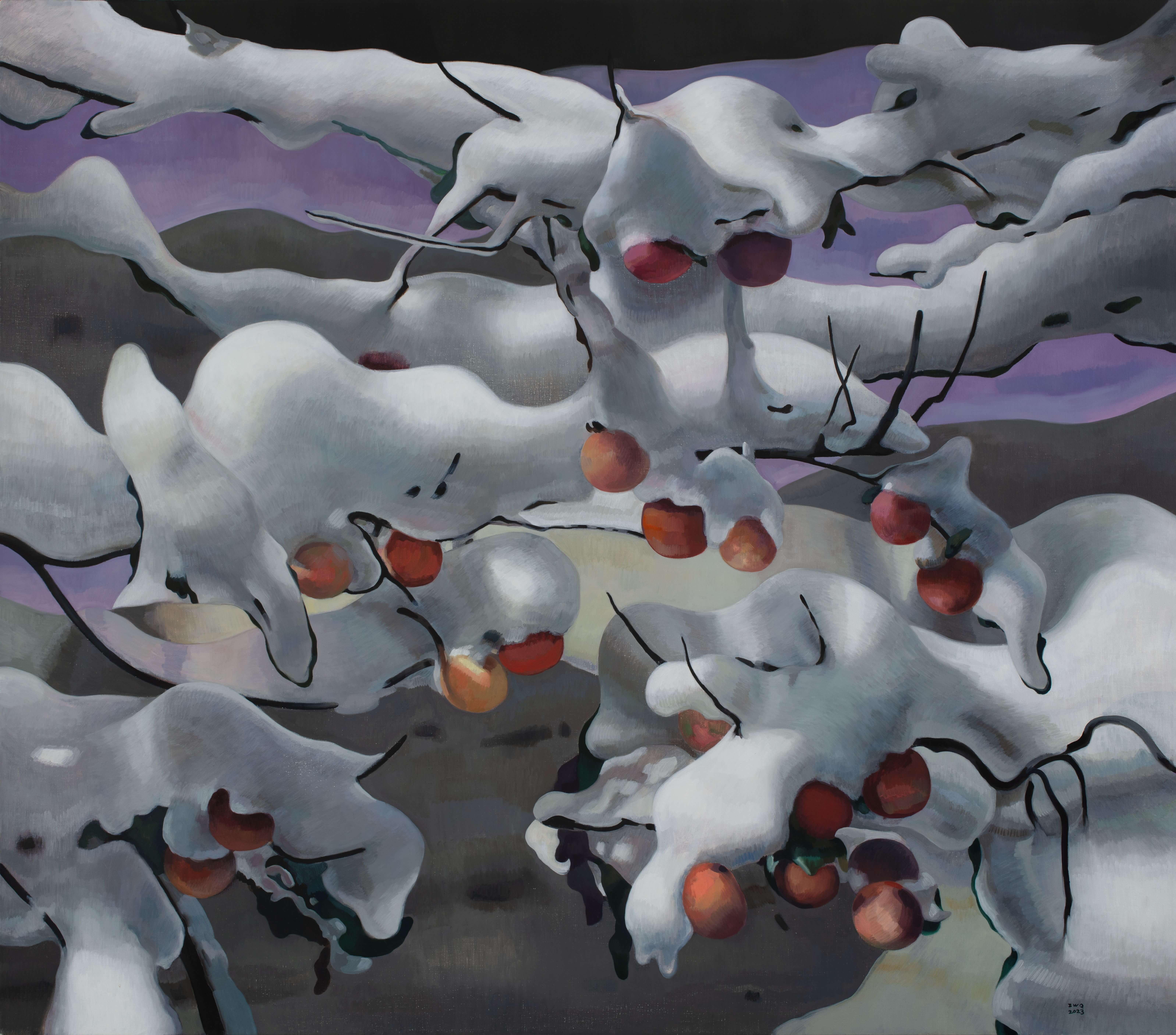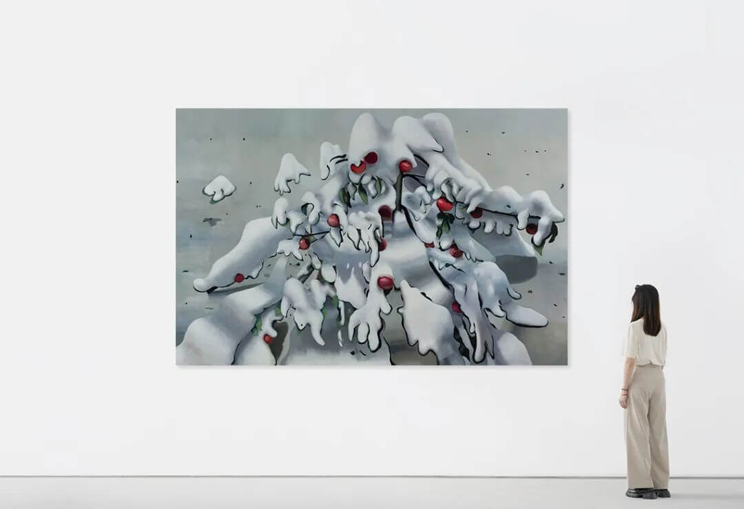 In 2019, Wenqin embarked on the creation of the "Fruit Trees Covered in Snow" series. The series originated from a dream where white snow fell on fruit trees, and the branches held a thick layer of snow, with red fruits adorning them, creating a fantastical and splendid scene. This dreamlike yet real-like image became the starting point, leading to a series of subsequent explorations.