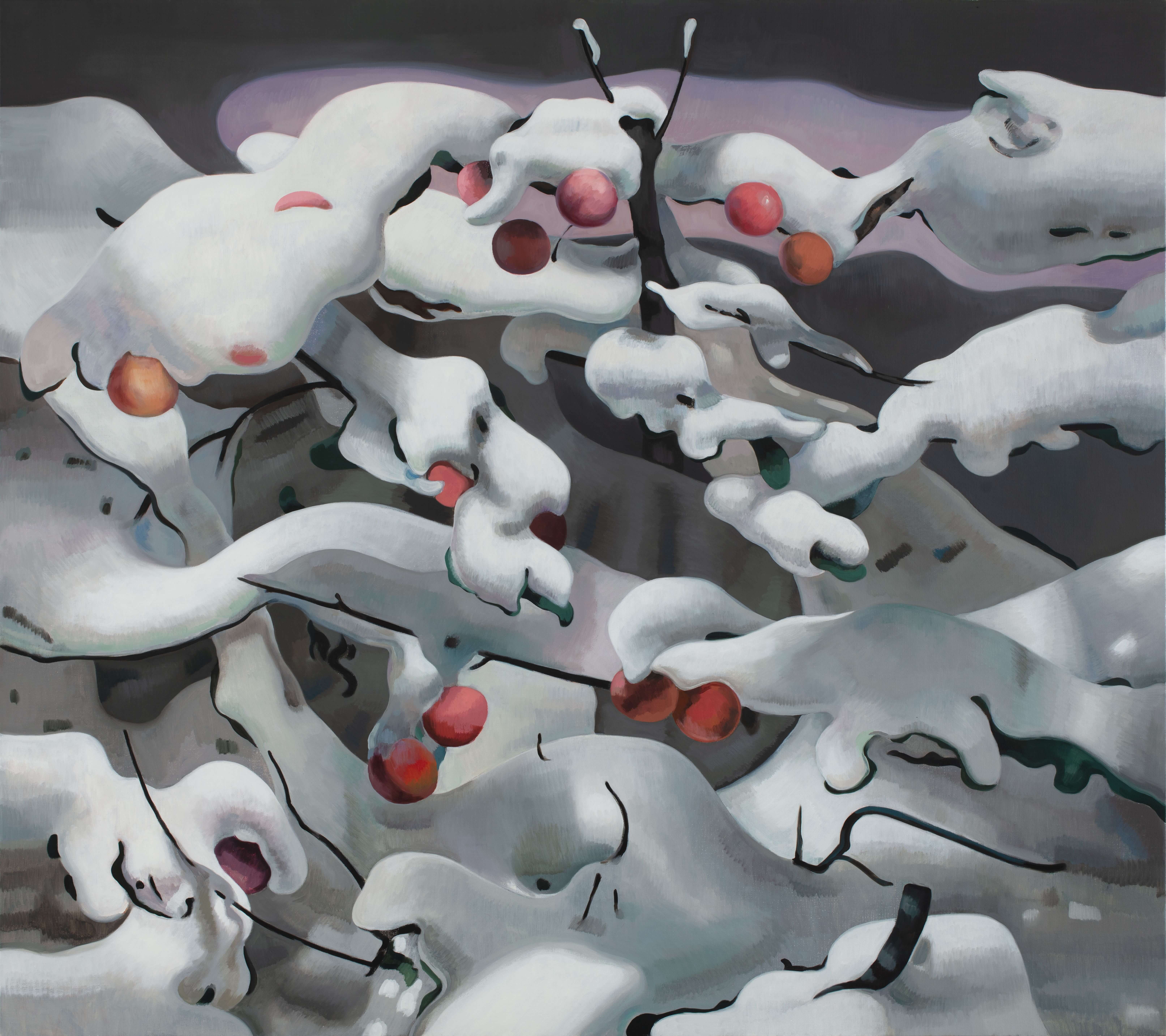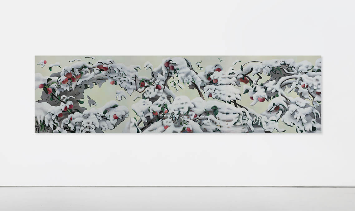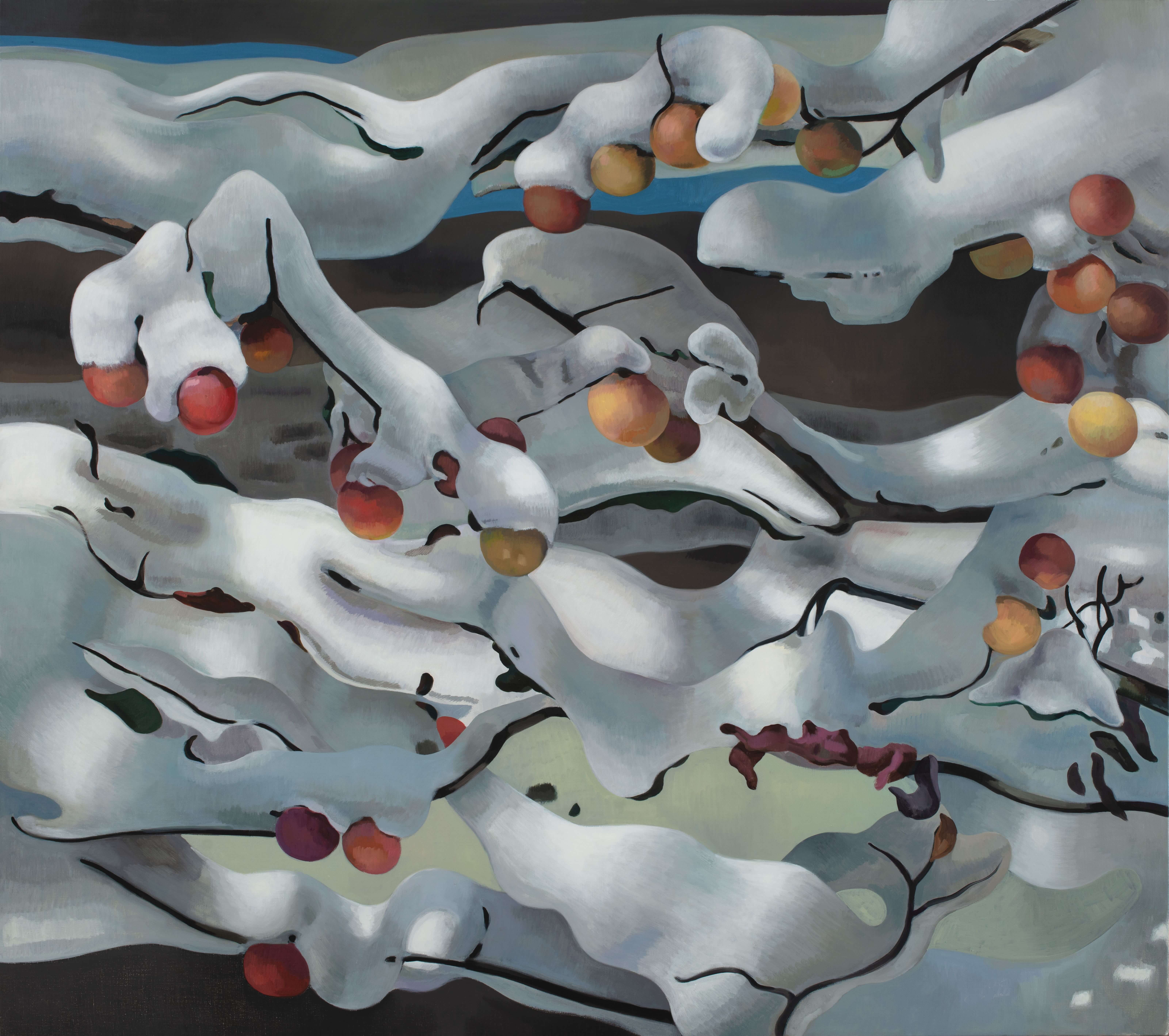 Starting with the basic depiction, Wenqin underwent various transformative efforts: stripping away its inherent meaning and projection, and solely presenting it from a formal perspective. The snow formations under his brush took on diverse shapes as if possessing individual lives, evoking endless imaginings like mythical creatures. The boundary between the snow and the branches was gradually strengthened, allowing the paintings to move further towards two-dimension. Amidst the white snow, branches, leaves, and red fruits, an endless array of structures, relationships, and expressions emerges with complex emotions.