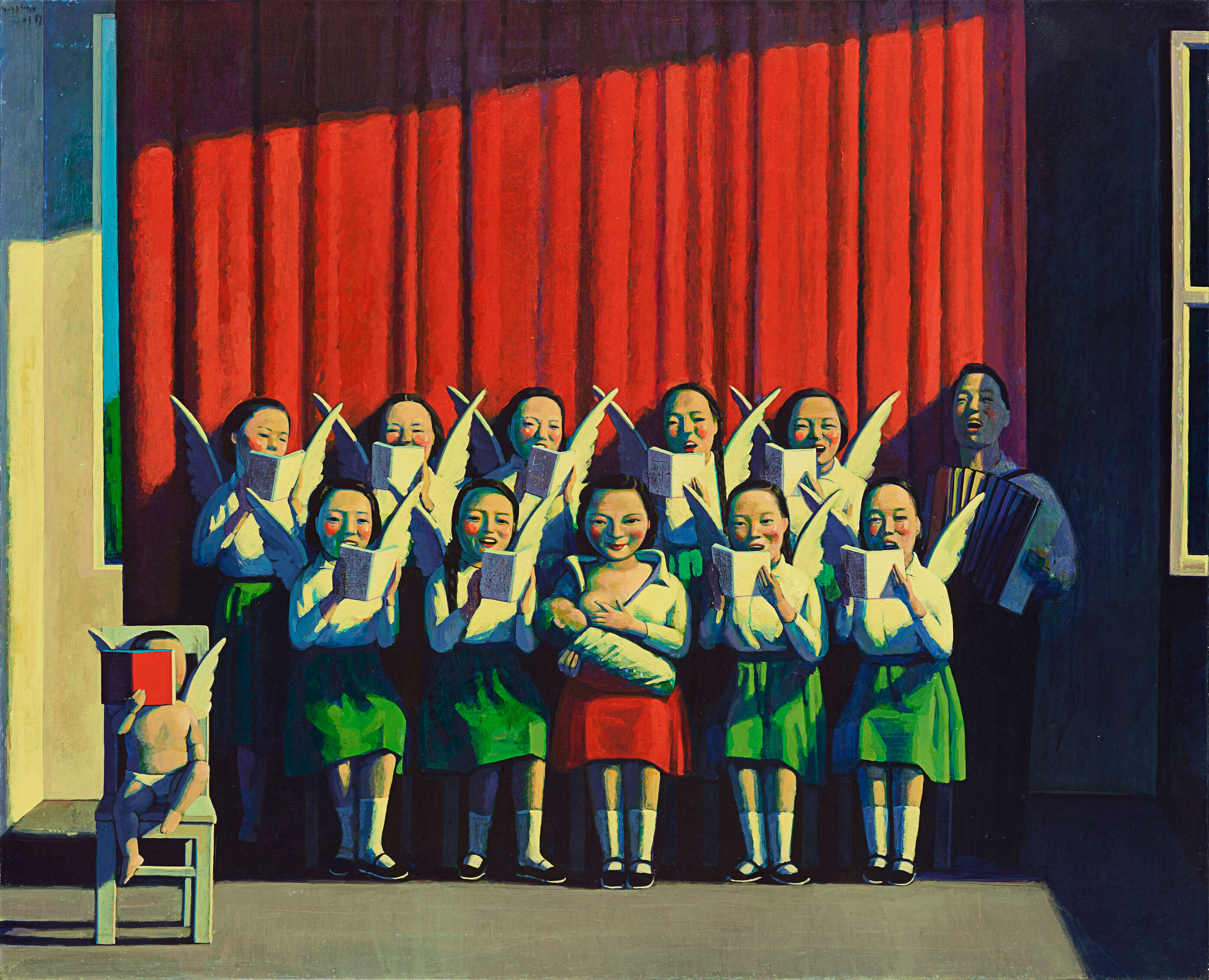 As one of the artist's representative works, Liu Ye's "Beijing Madonna" was influenced by metaphysical painting and surrealism, showing a dreamlike feeling of reality and unreality. In the picture, a group of winged men and women are singing in front of a red curtain. This surreal scene creates a mysterious atmosphere, making the audience feel as if they are in a dreamlike world when appreciating it.
