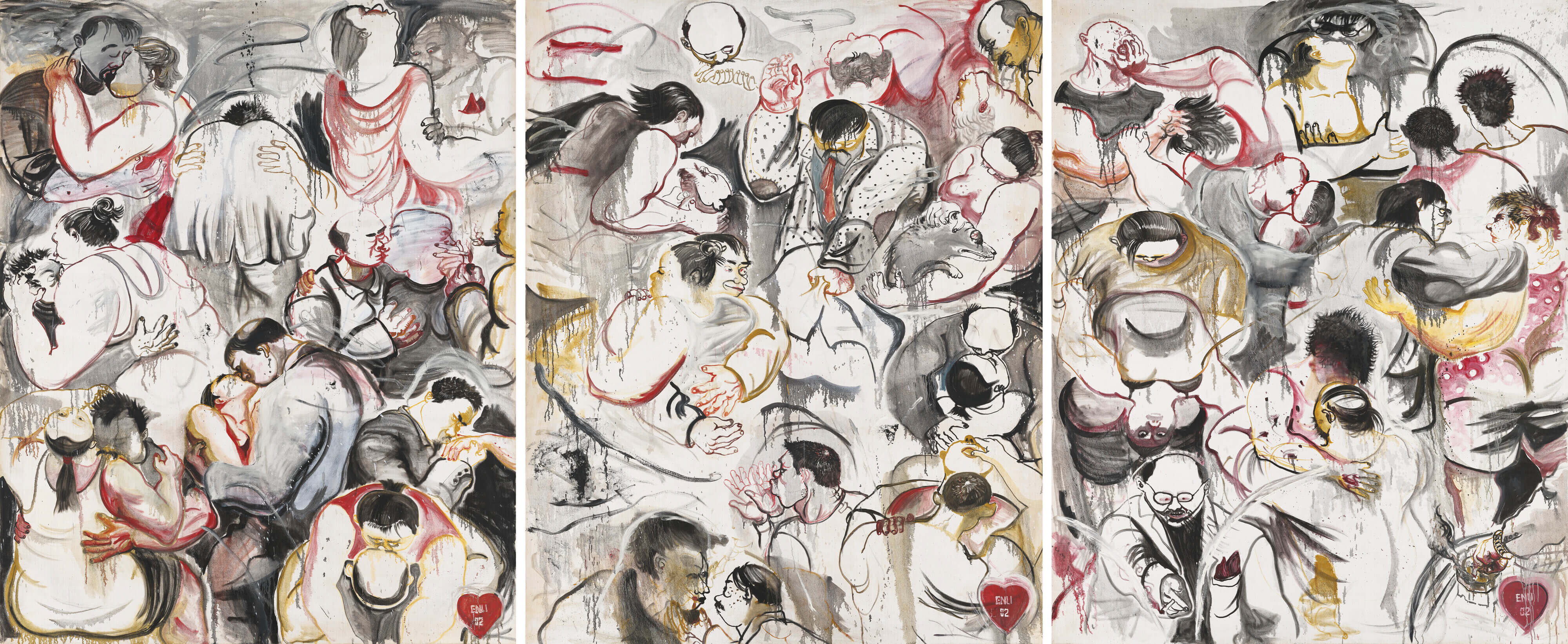 The "Intimacy" series consists of three 250x200cm paintings that extend horizontally into a 250x600cm overall space. Nearly 50 characters, hugging, kissing, whispering, and meditating, weave a complex network of emotions in the gray and white main tone of the picture. The artist cleverly uses highly saturated color blocks such as red and yellow to break the silence, combined with the iconic thin painting technique, to present subtle light and shadow flows and emotional gradients in the transparent texture.